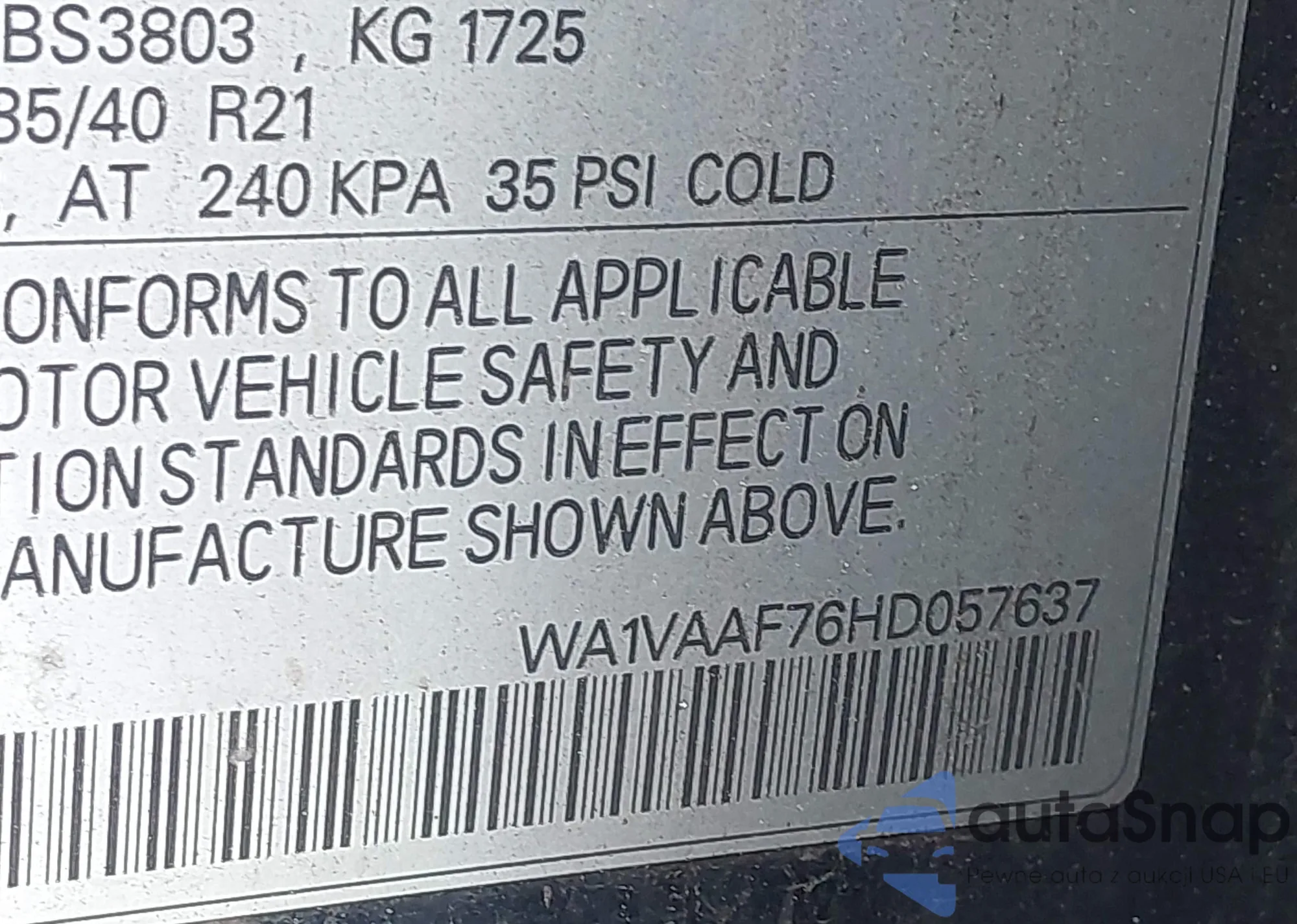LOT: 42312791 VIN: WA1VAAF76HD057637