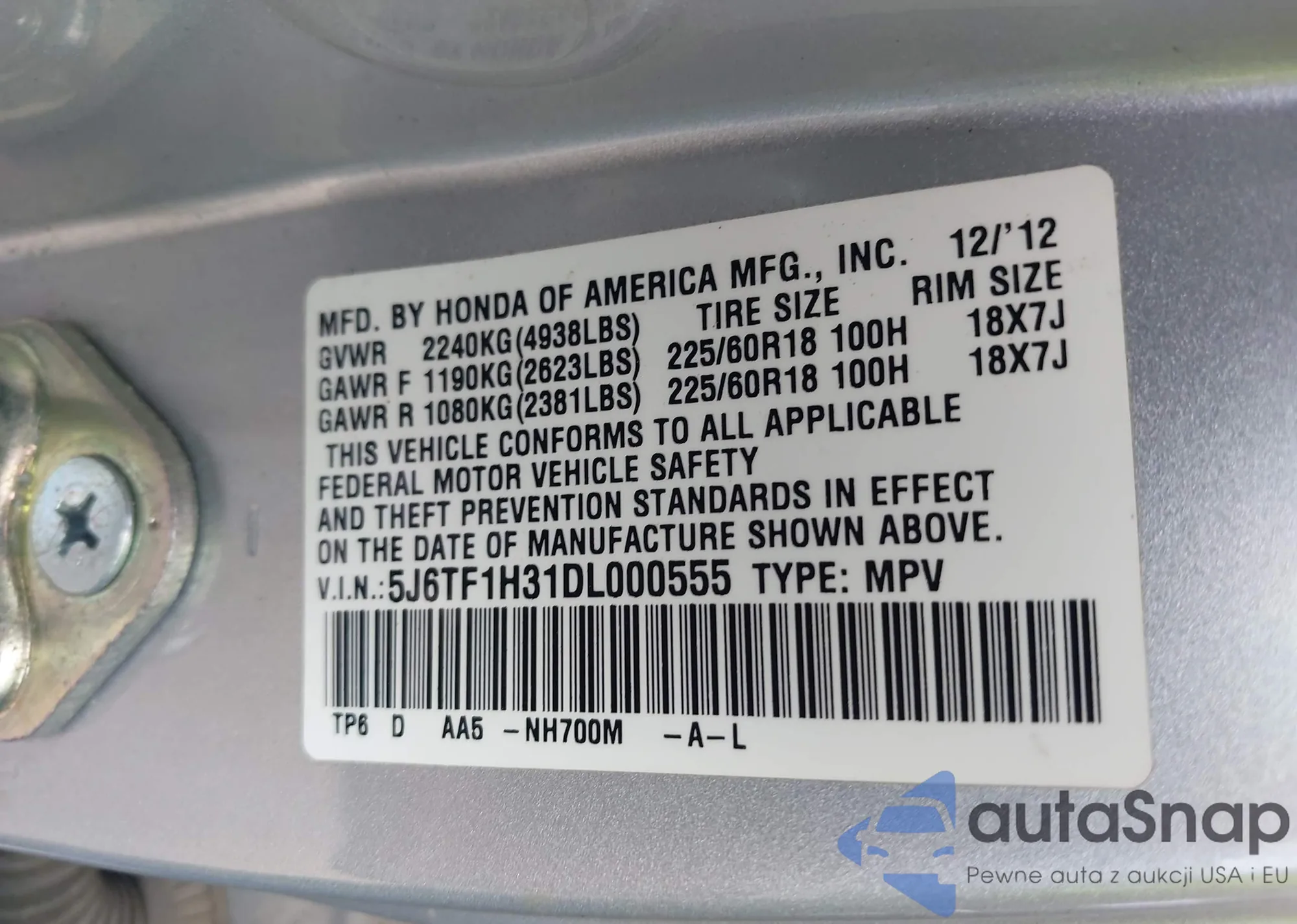 • VIN 5J6TF1H31DL000555