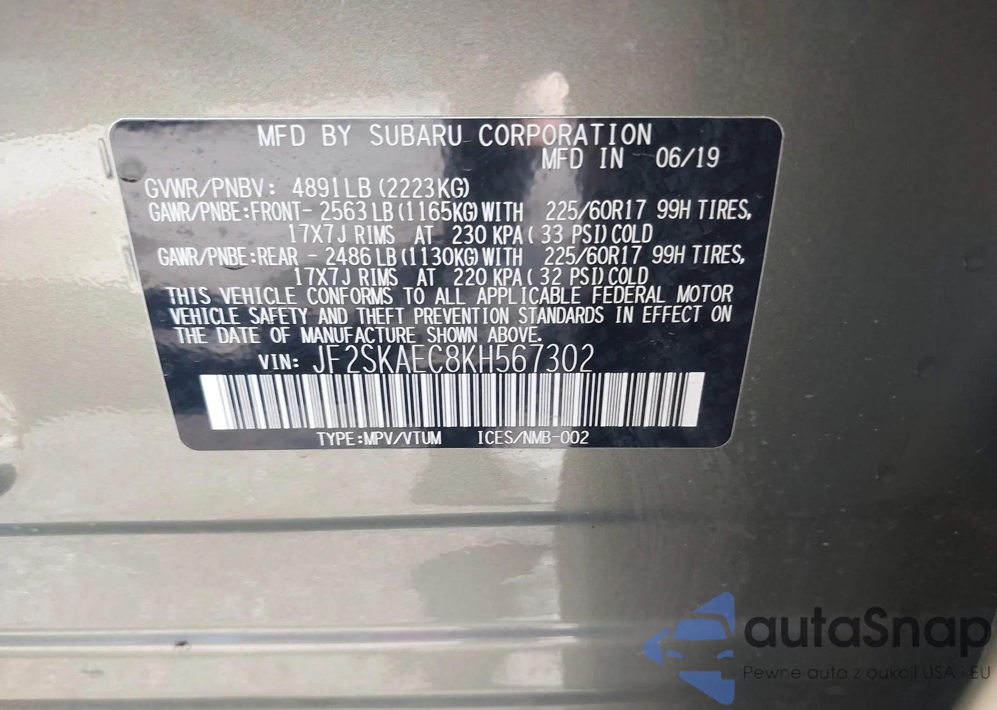 • VIN JF2SKAEC8KH567302