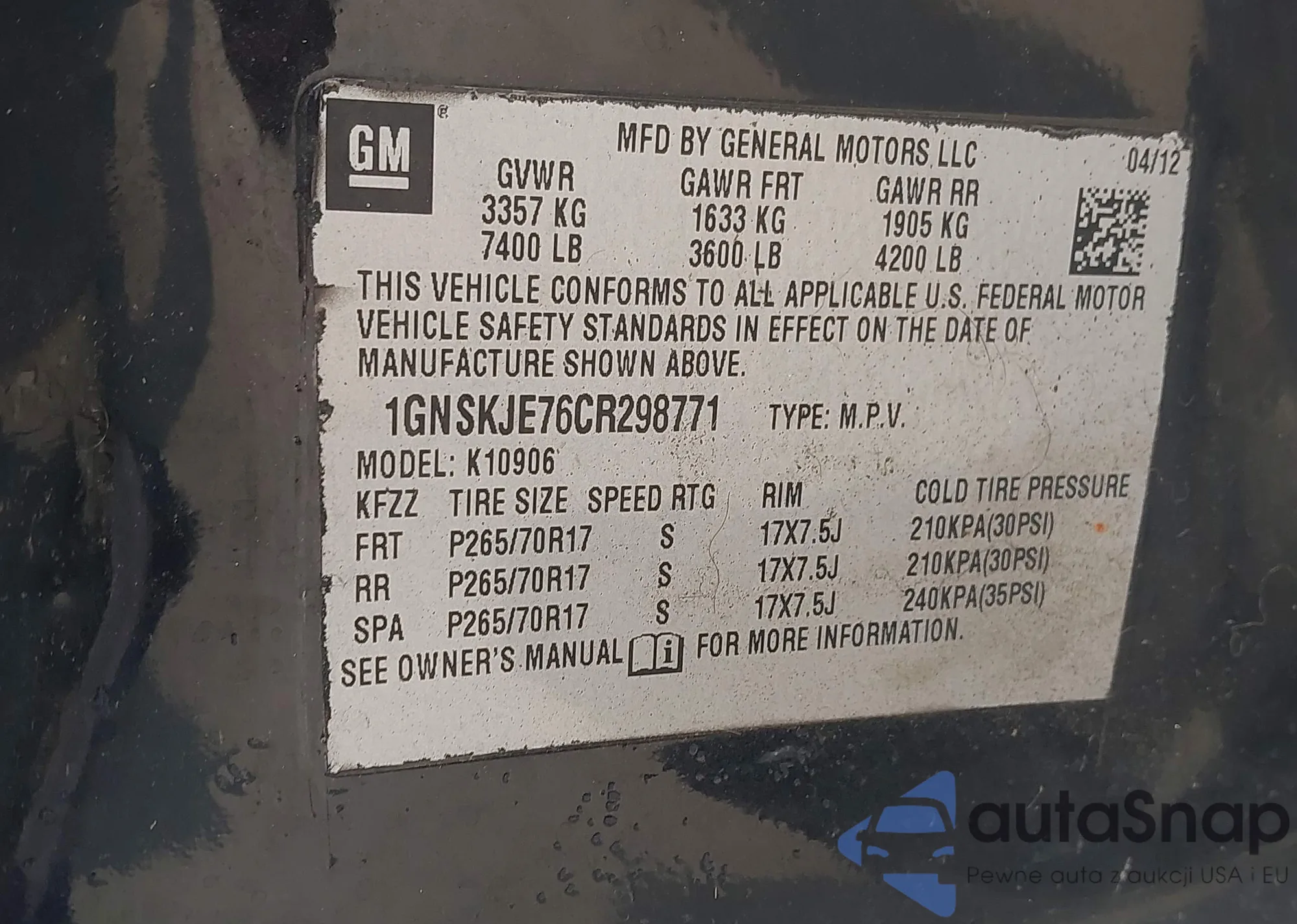 LOT: 43187386 VIN: 1GKS2EEF1CR136851