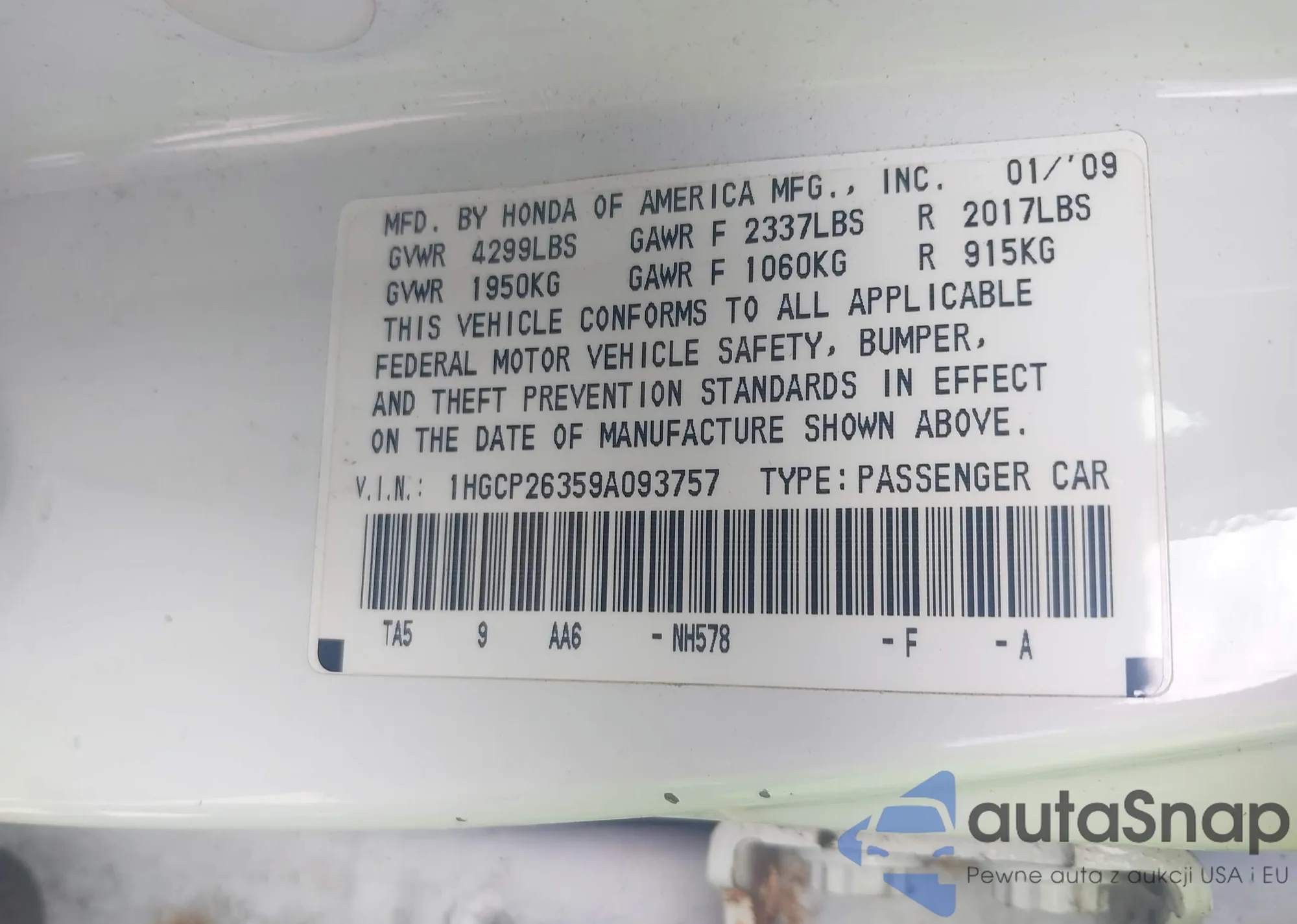 LOT: 43245826 VIN: 1HGCP26359A093757