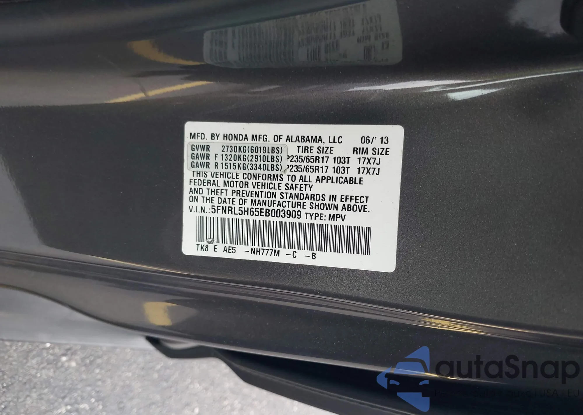 • VIN 5FNRL5H65EB003909
