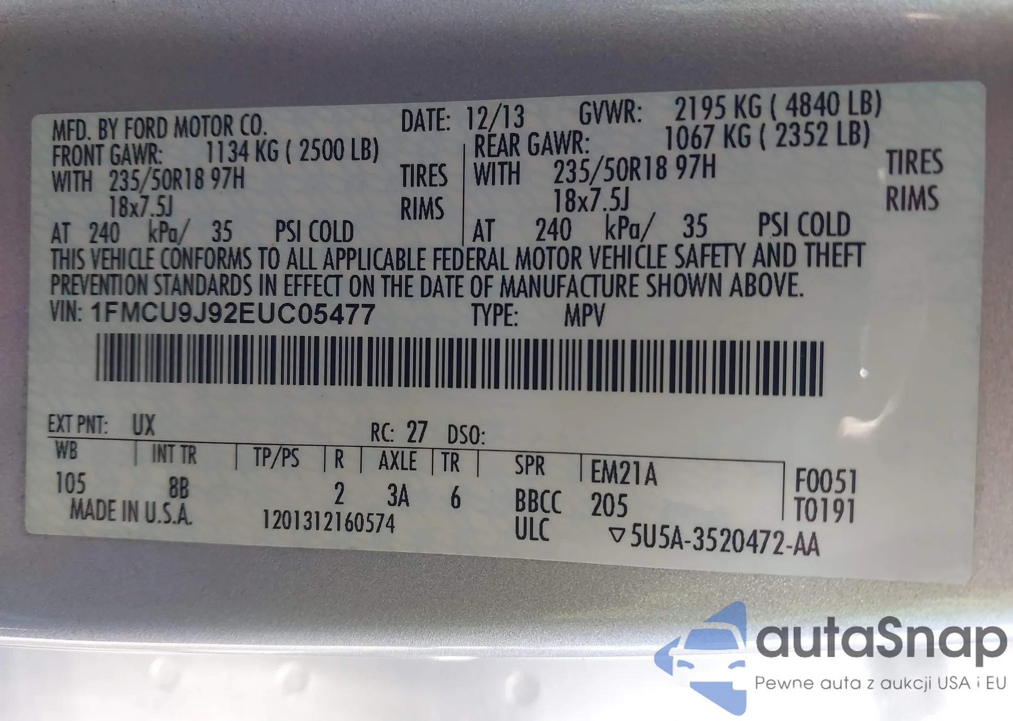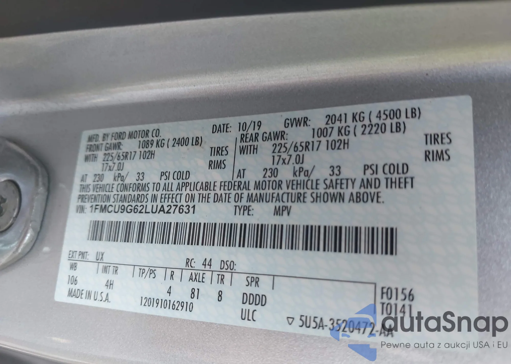 • VIN 1FMCU9G62LUA27631