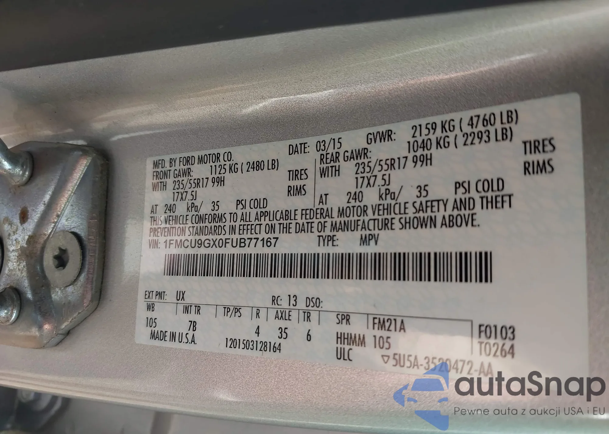 LOT: 43136062 VIN: 1FMCU9GX0FUB77167