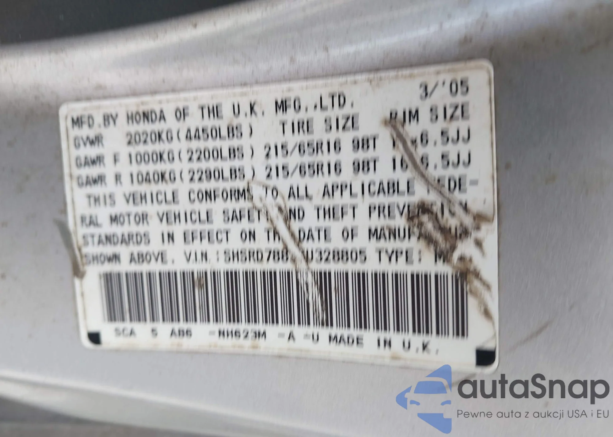 • VIN SHSRD78835U328805