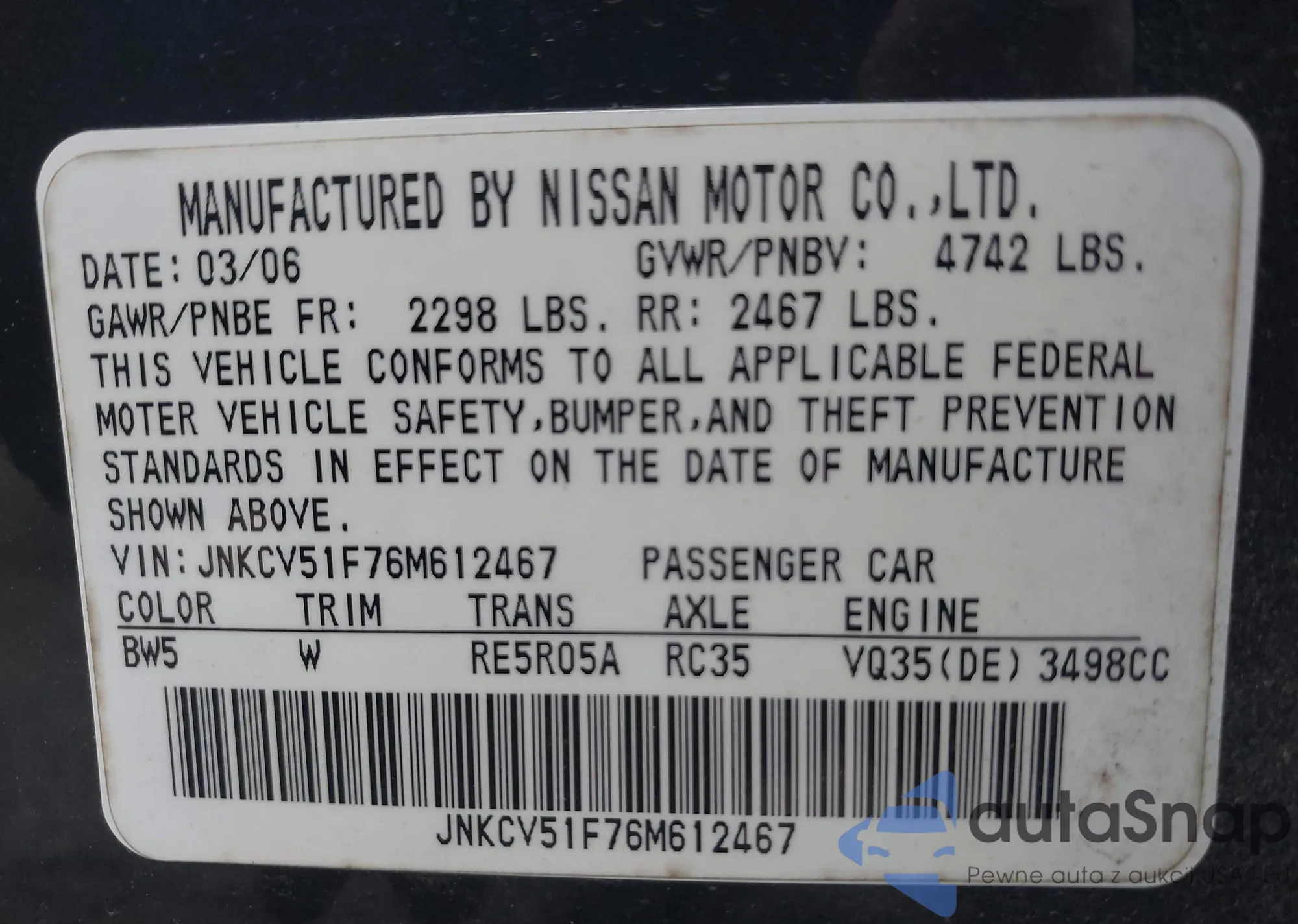 2006 Infiniti G35X z USA, uszkodzony, nr VIN JNKCV51F76M612467