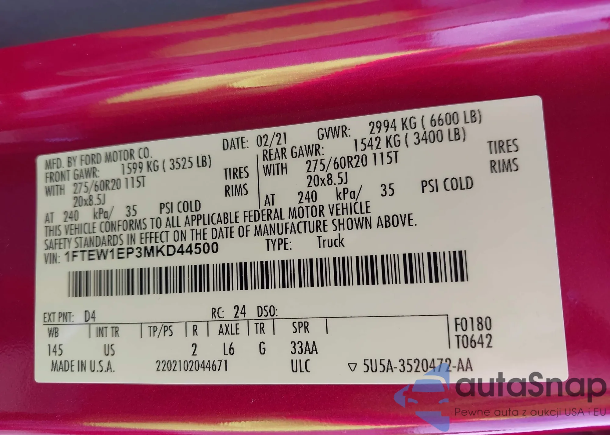 LOT: 43195644 VIN: 1FTEW1EP3MKD44500