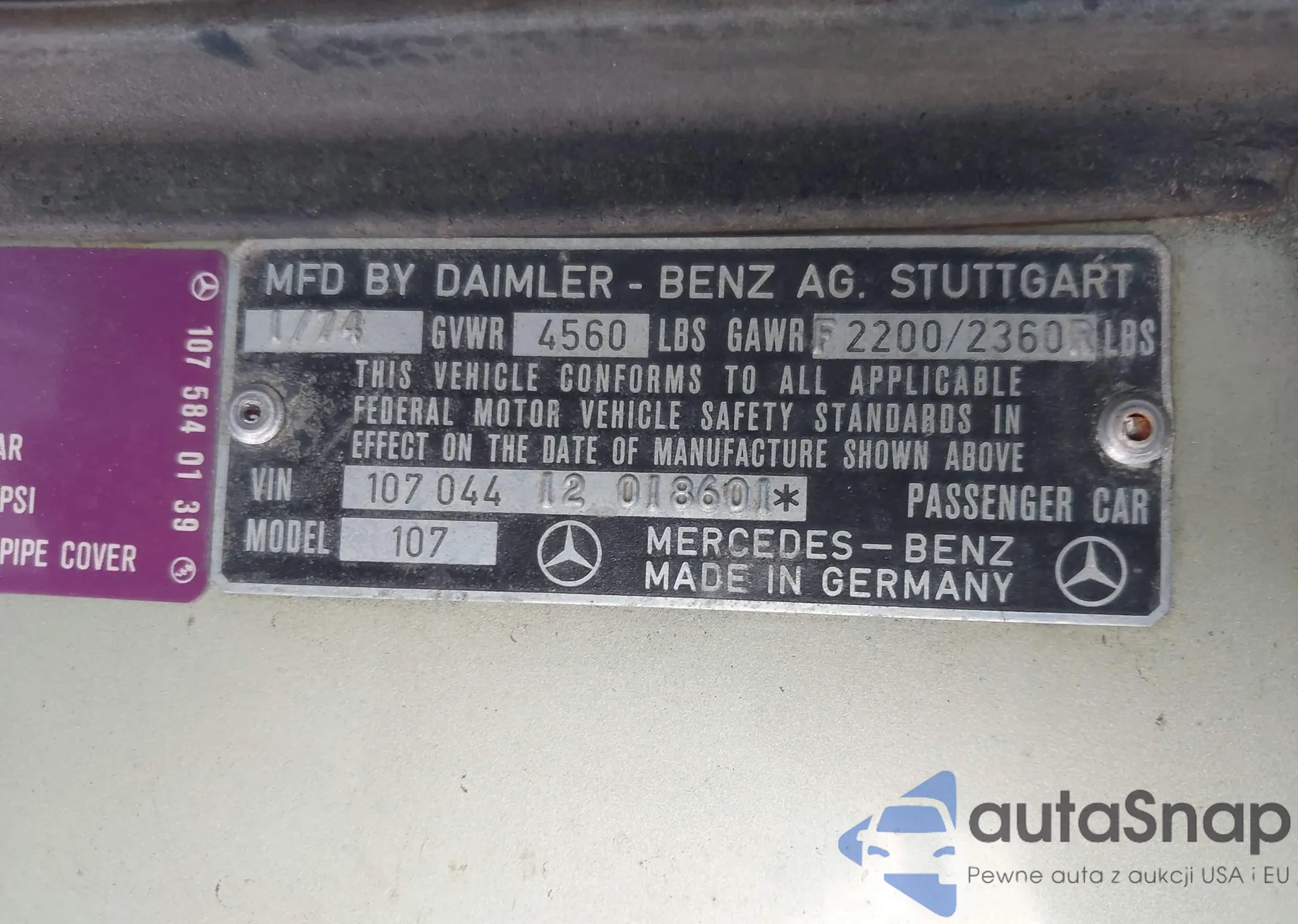 1974 Mercedes-Benz 450Sl z USA, uszkodzony, nr VIN 10704412018601