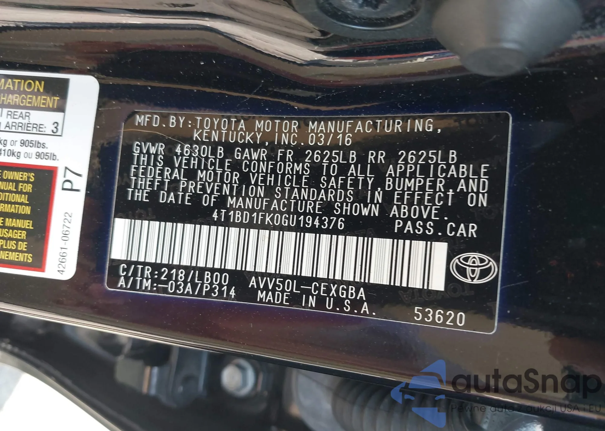 • VIN 4T1BD1FK0GU194376