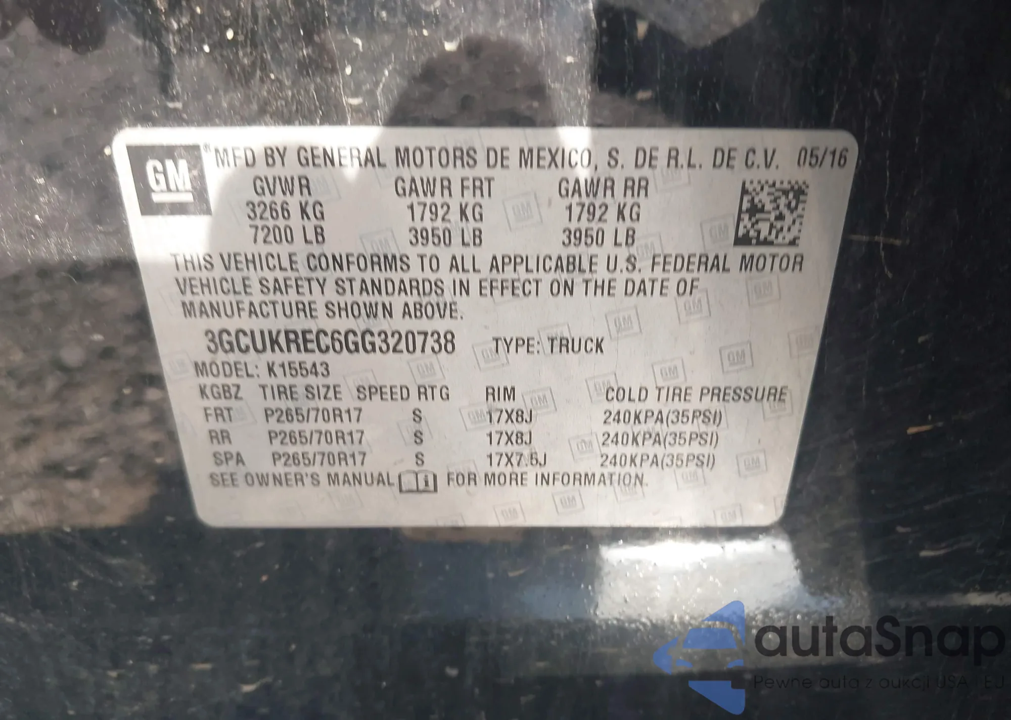 LOT: 42851178 VIN: 3GCUKREC6GG320738