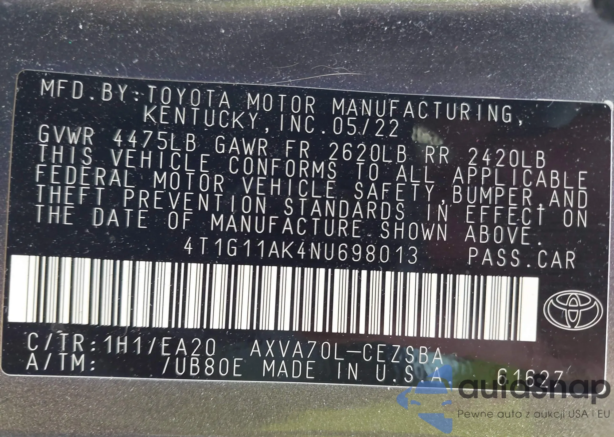 • VIN 4T1G11AK4NU698013