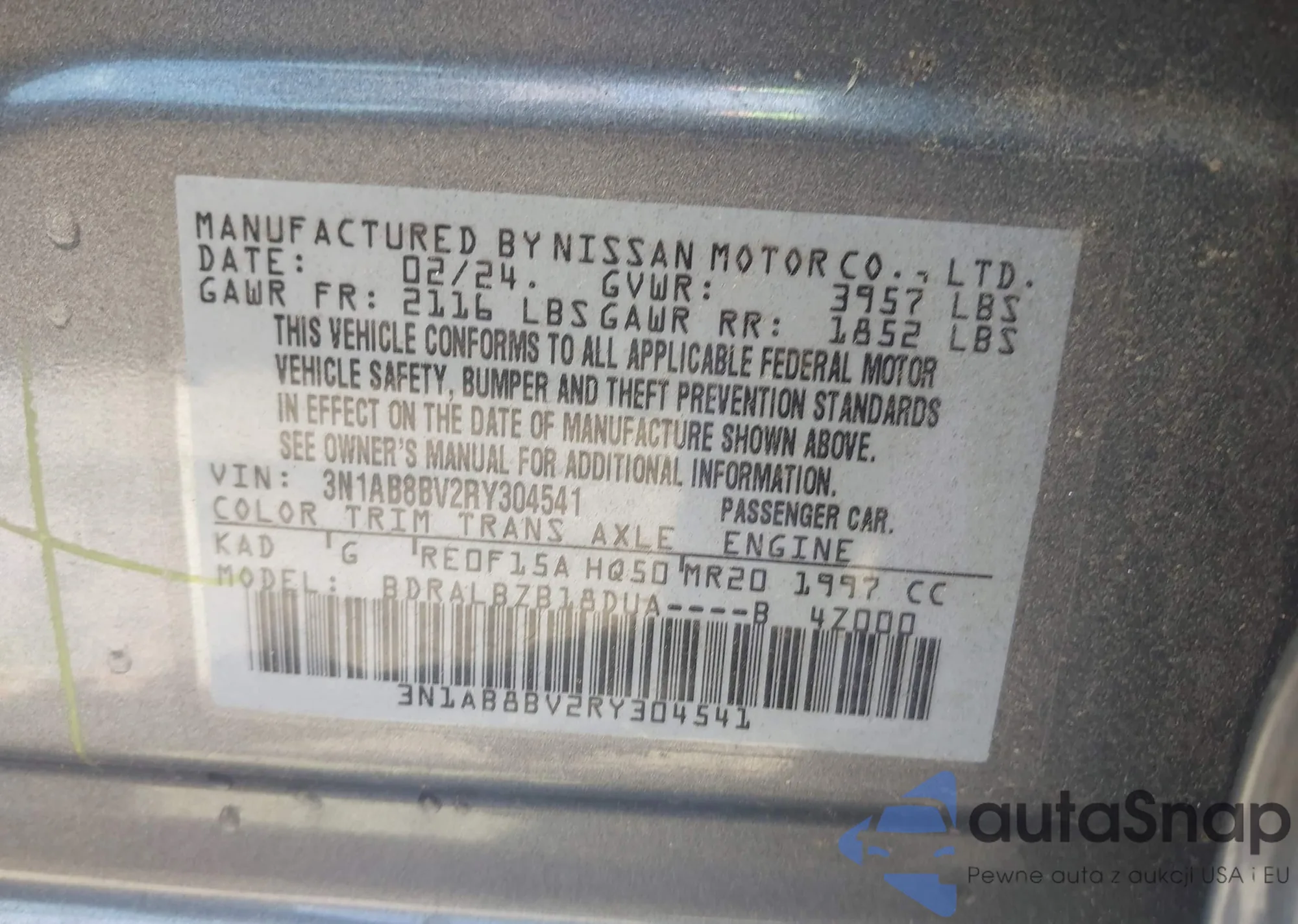 • VIN 3N1AB8BV2RY304541