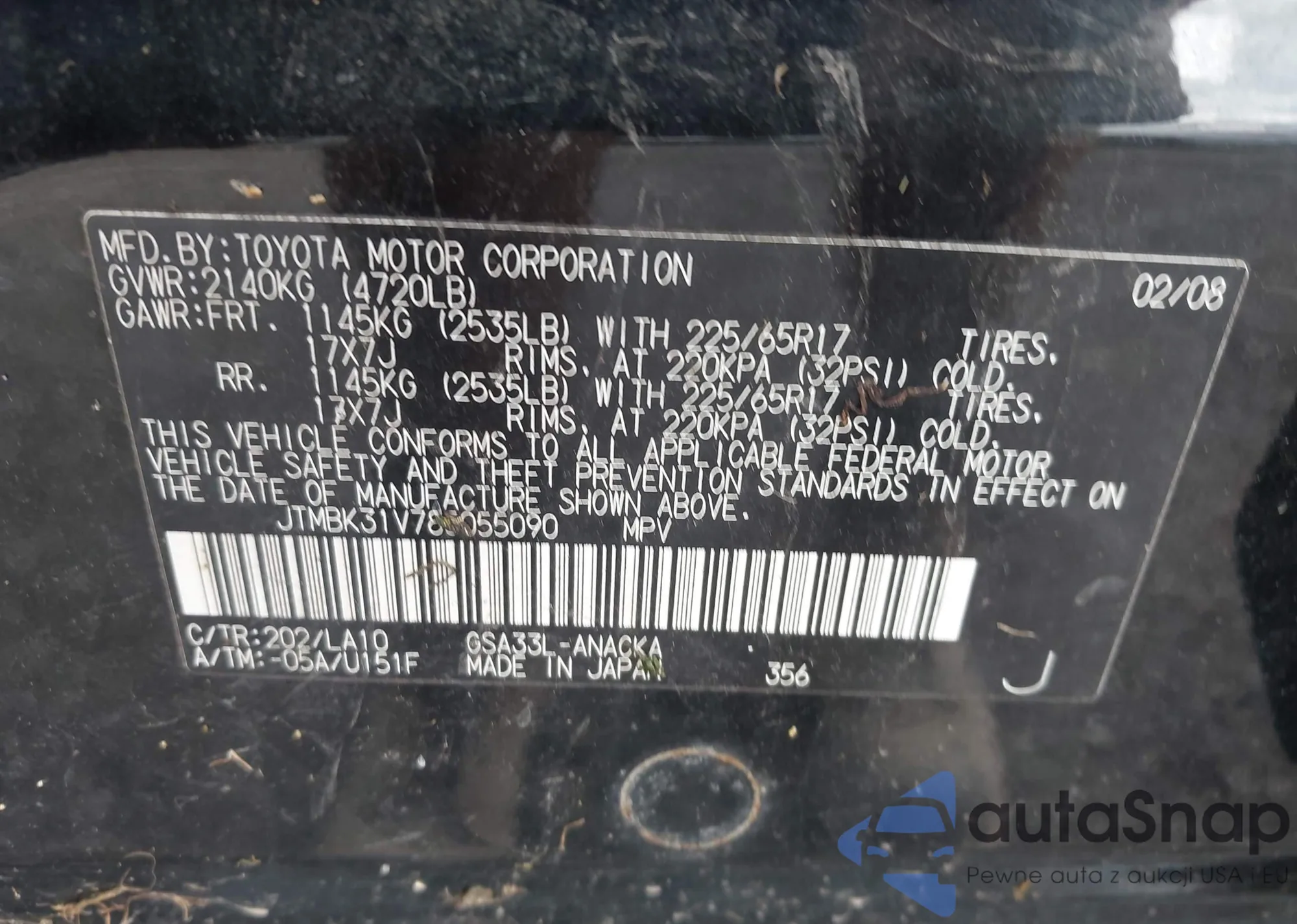 LOT: 43080189 VIN: JTMBK31V785055090