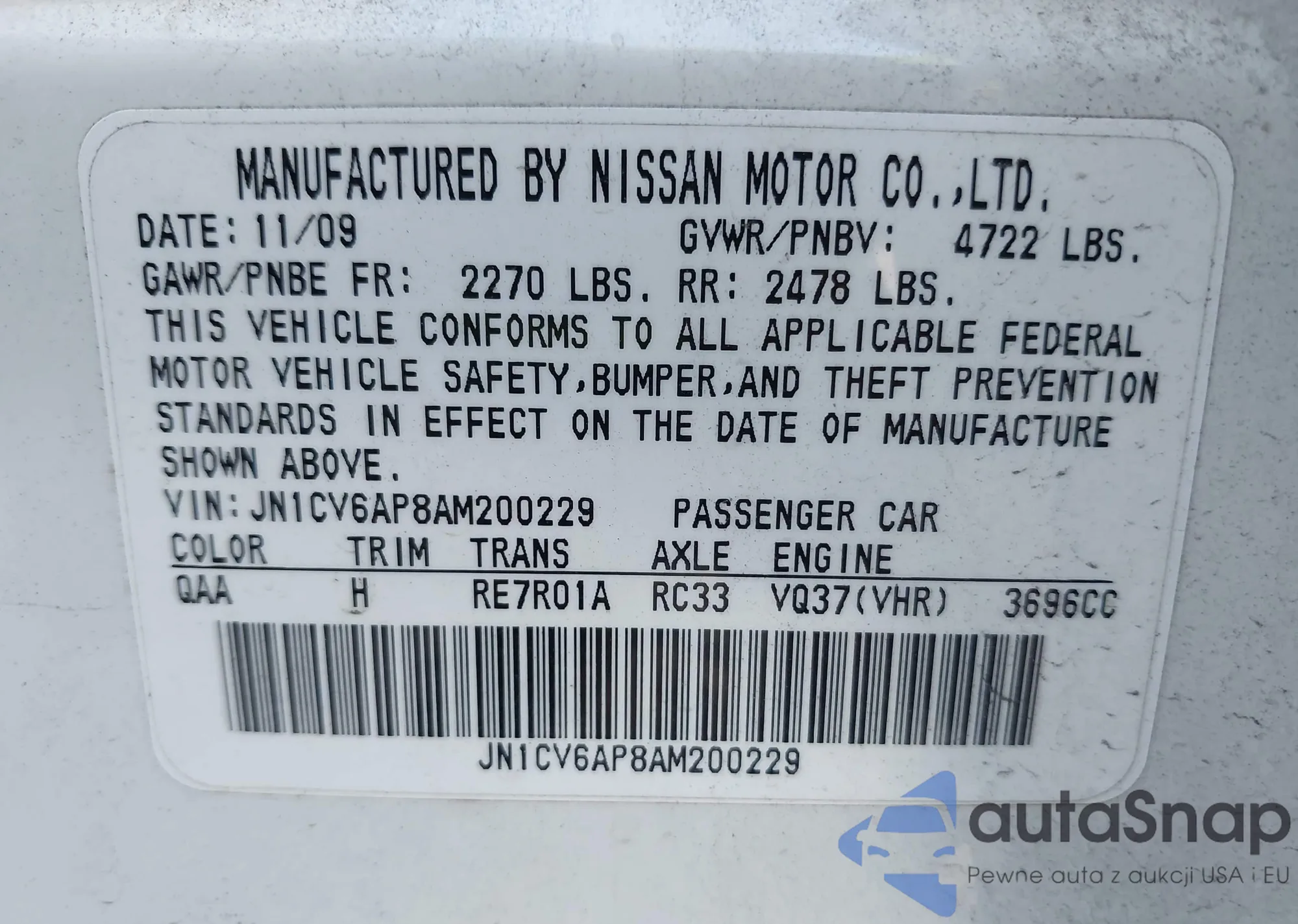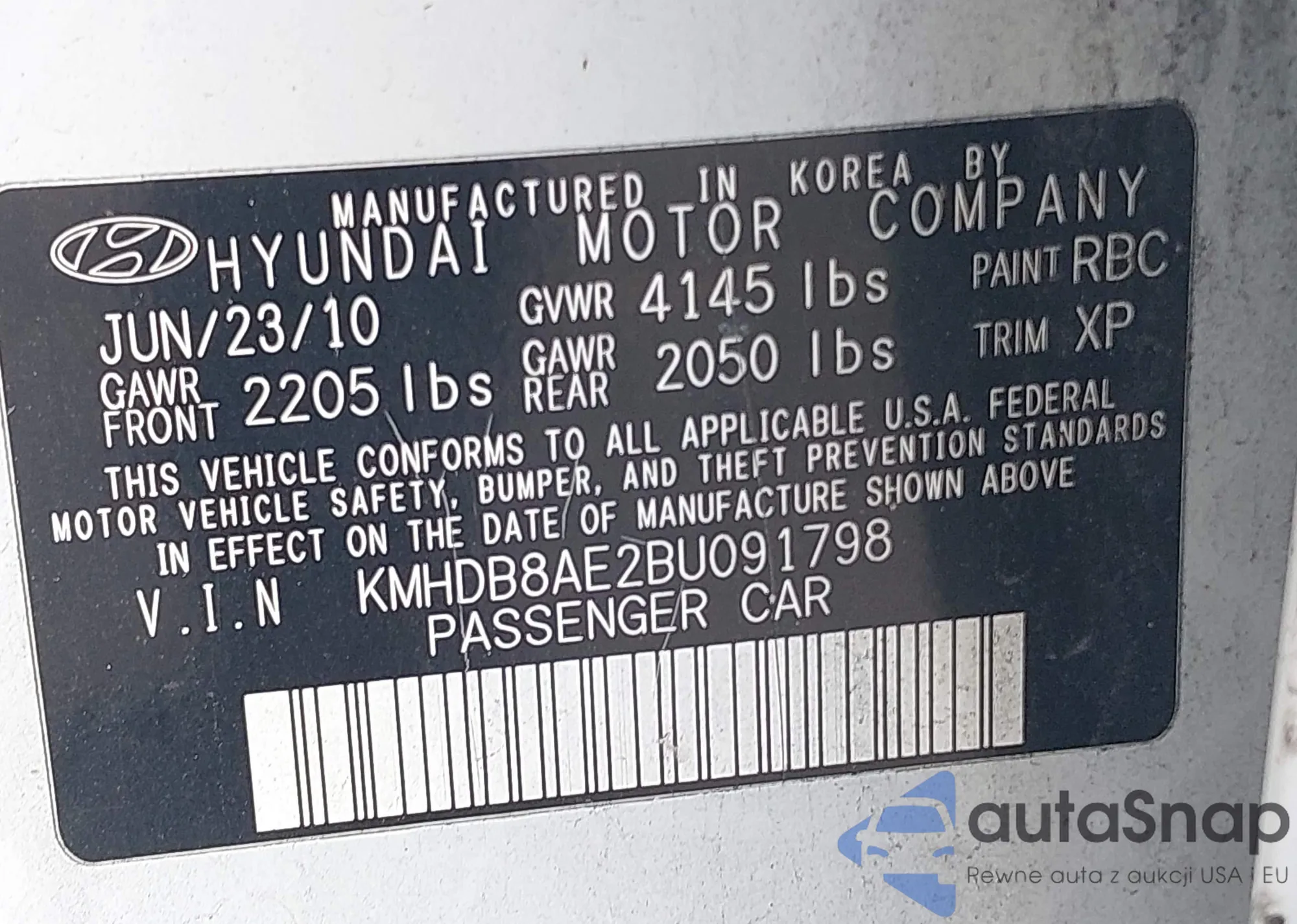 LOT: 43303077 VIN: KMHDB8AE2BU091798