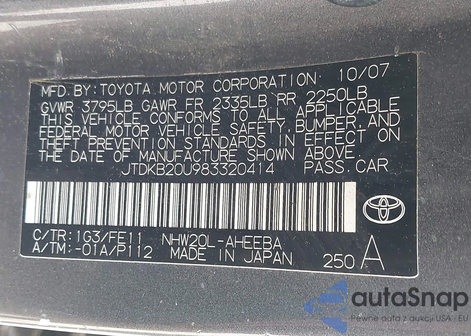 LOT: 43363906 VIN: JTDKB20U983320414