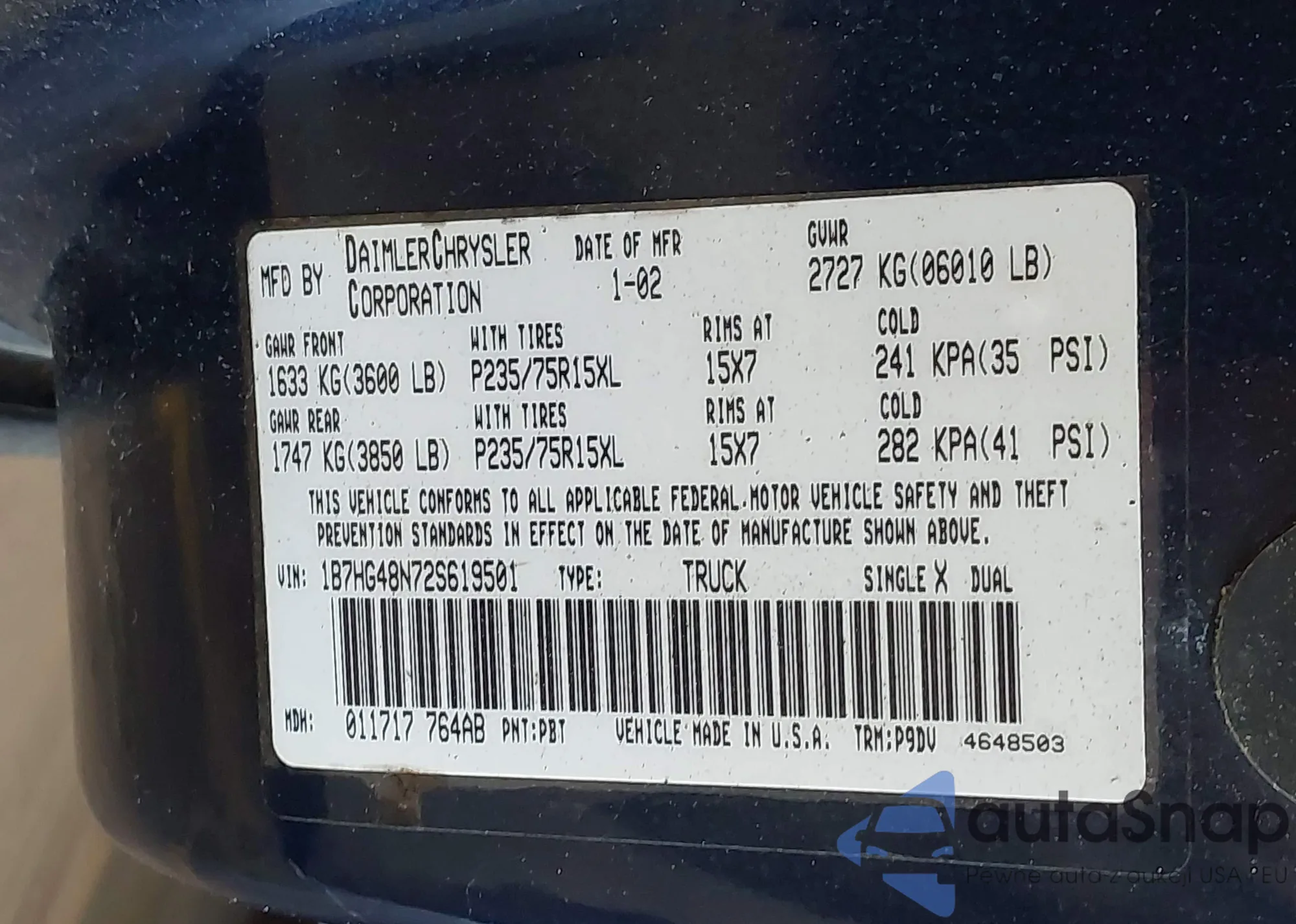 • VIN 1B7HG48N72S619501