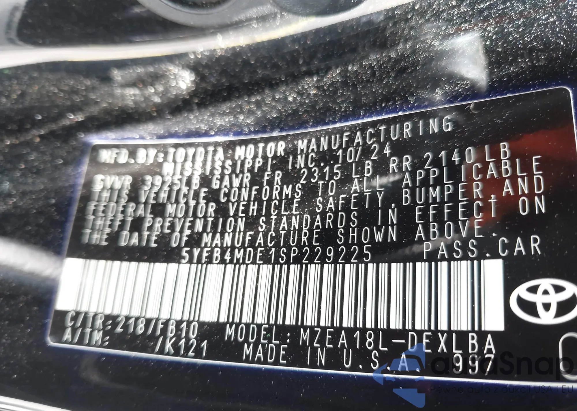 • VIN 5YFB4MDE1SP229225