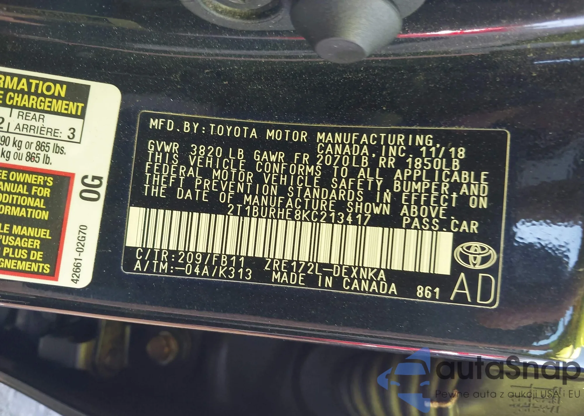 LOT: 43097830 VIN: 2T1BURHE8KC213417