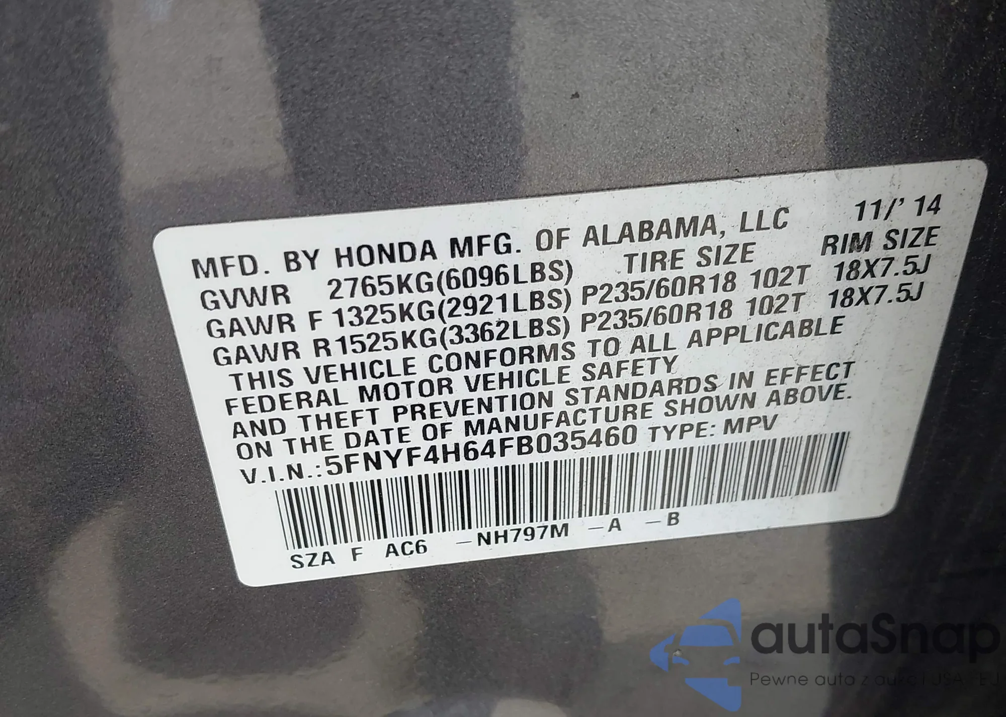 LOT: 42590295 VIN: 5FNYF4H64FB035460