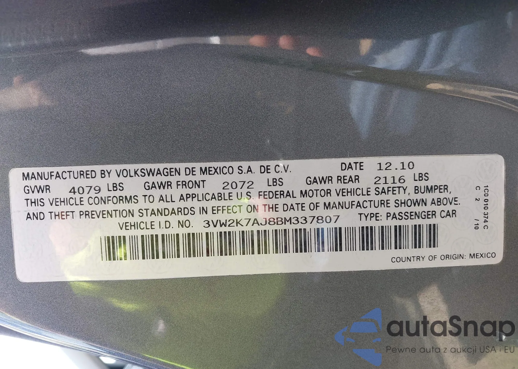 • VIN 3VW2K7AJ8BM337807