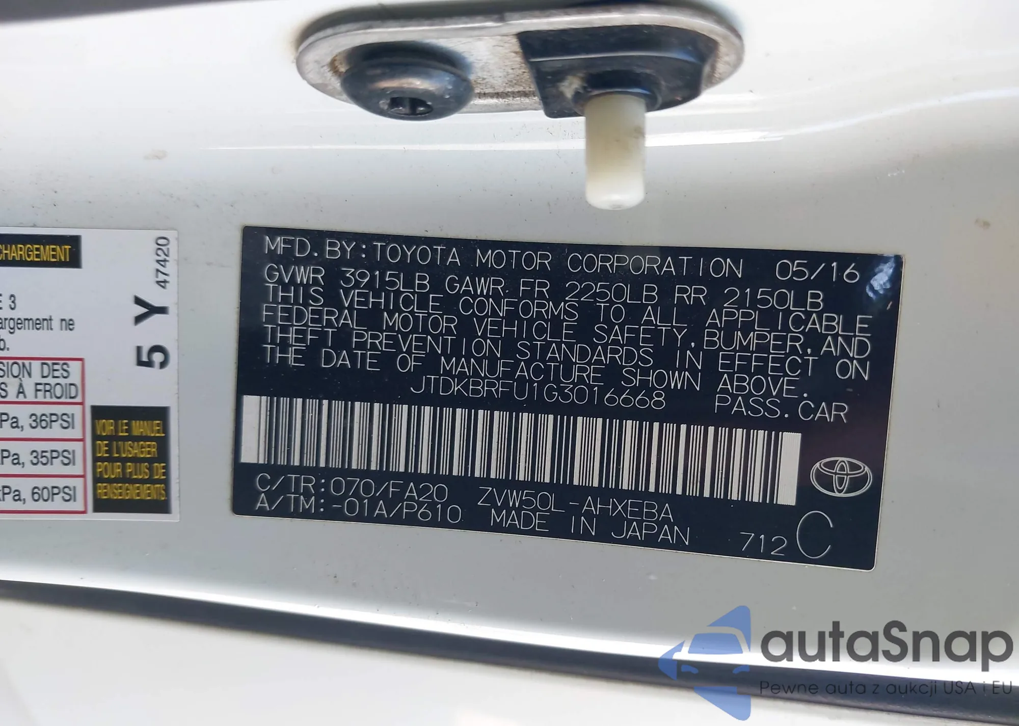 LOT: 42962328 VIN: JTDKBRFU1G3016668