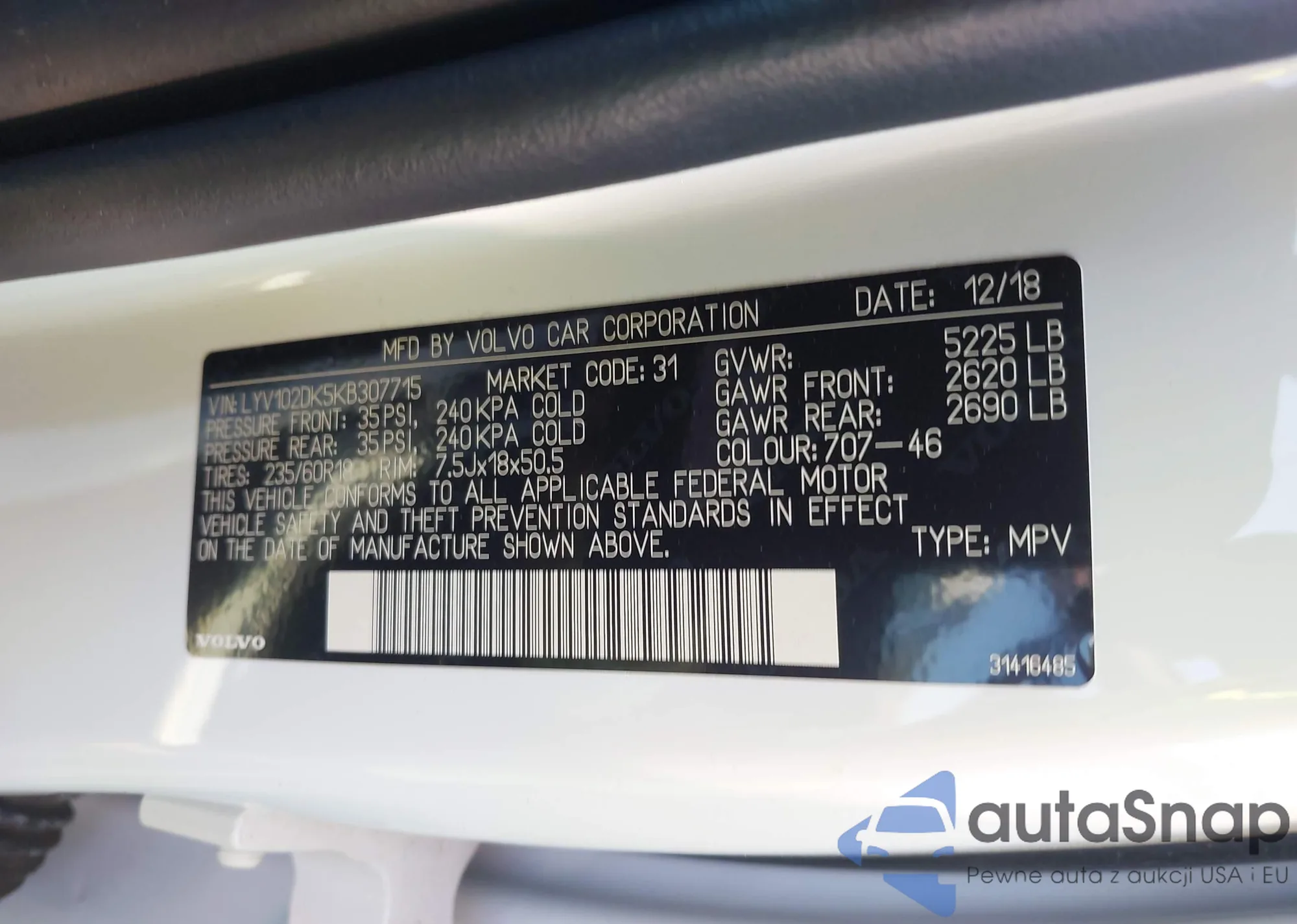 LOT: 43215218 VIN: LYV102DK5KB307715