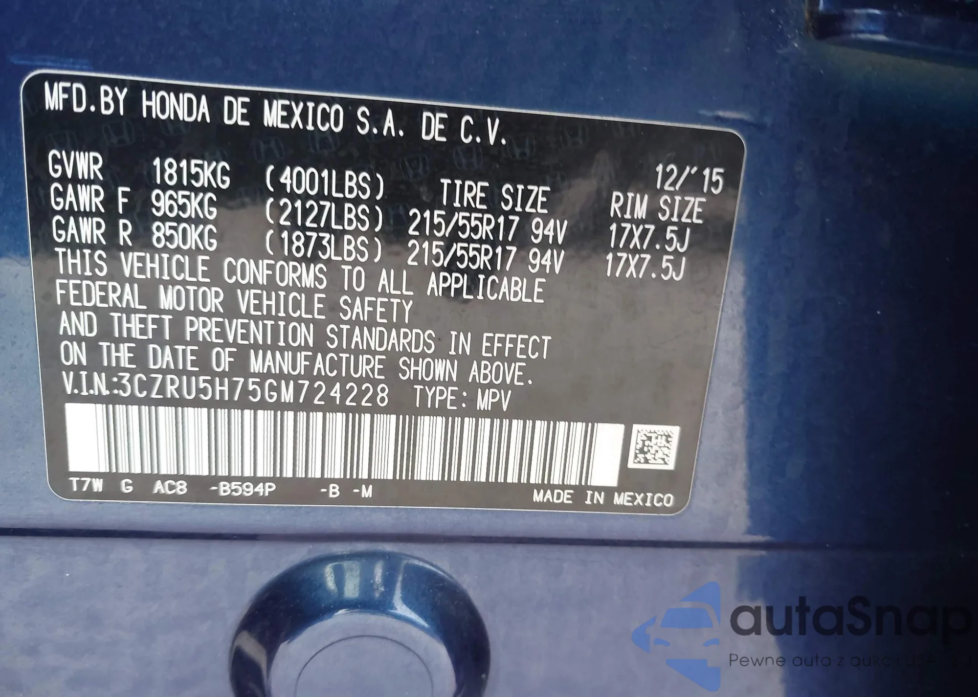 • VIN 3CZRU5H75GM724228