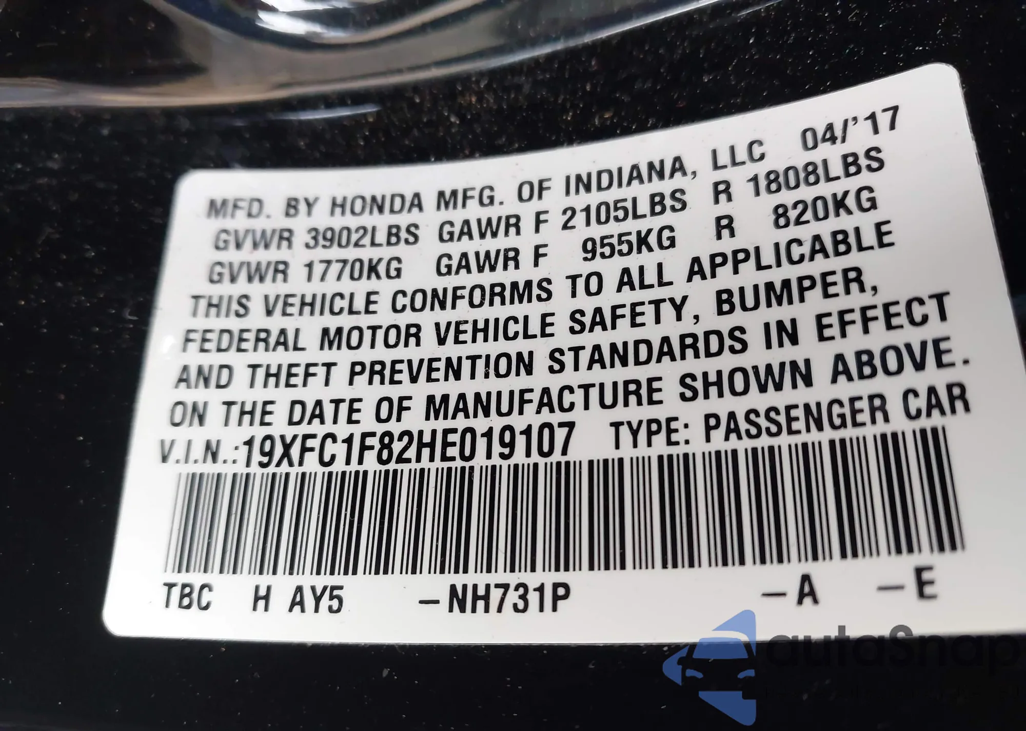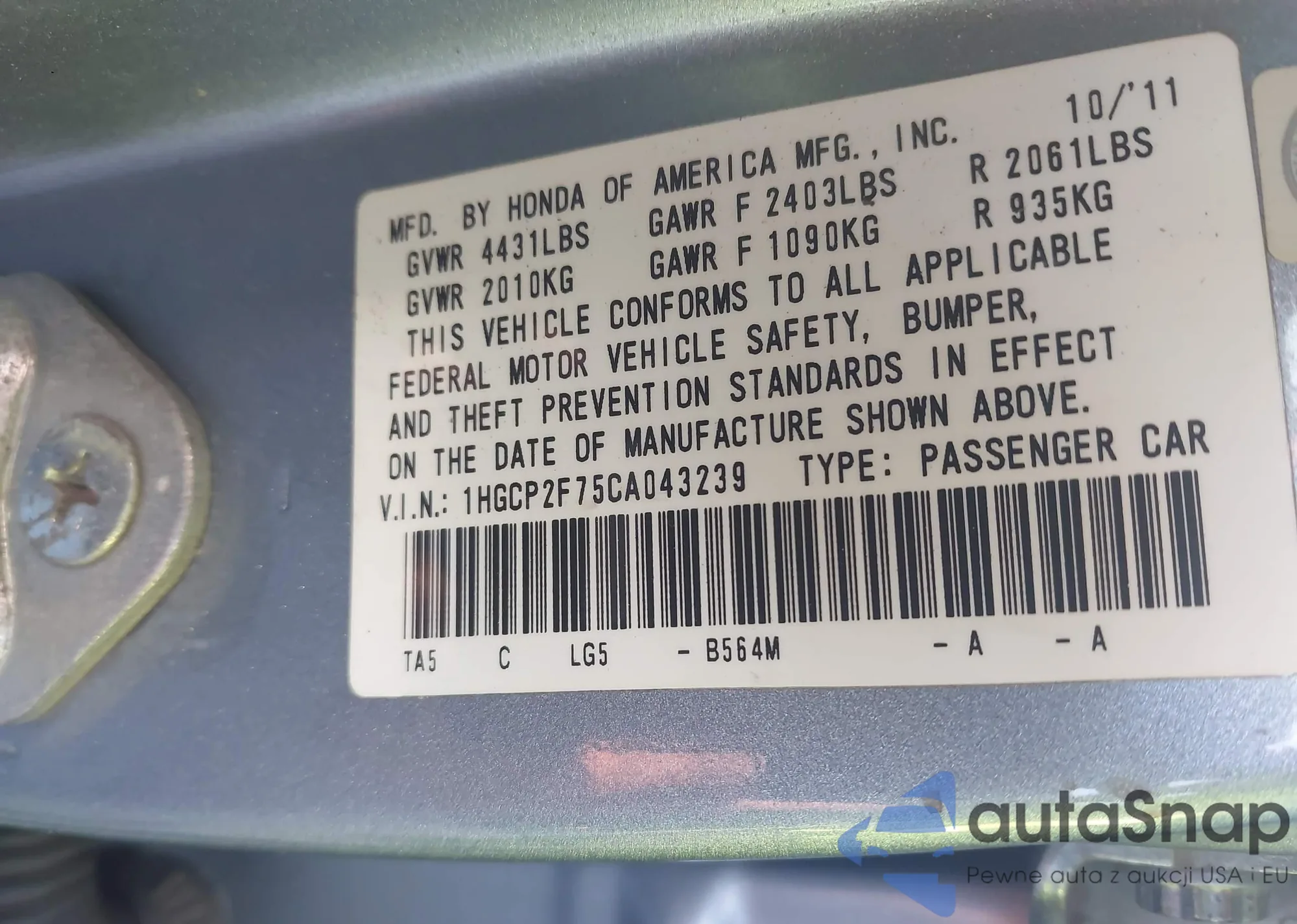 LOT: 43277733 VIN: 1HGCP2F75CA043239
