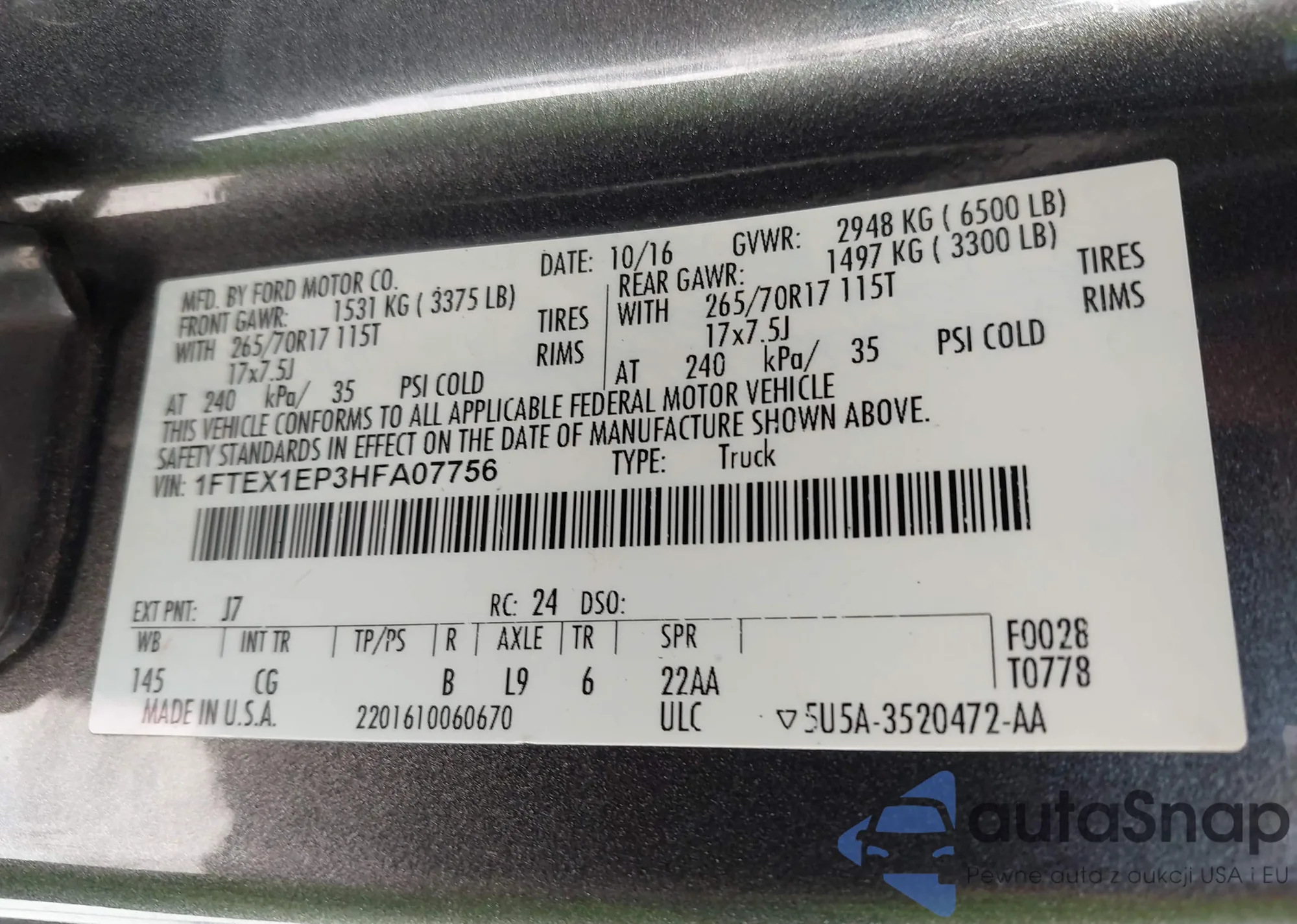 LOT: 43118469 VIN: 1FTFW1EF1GFA32779