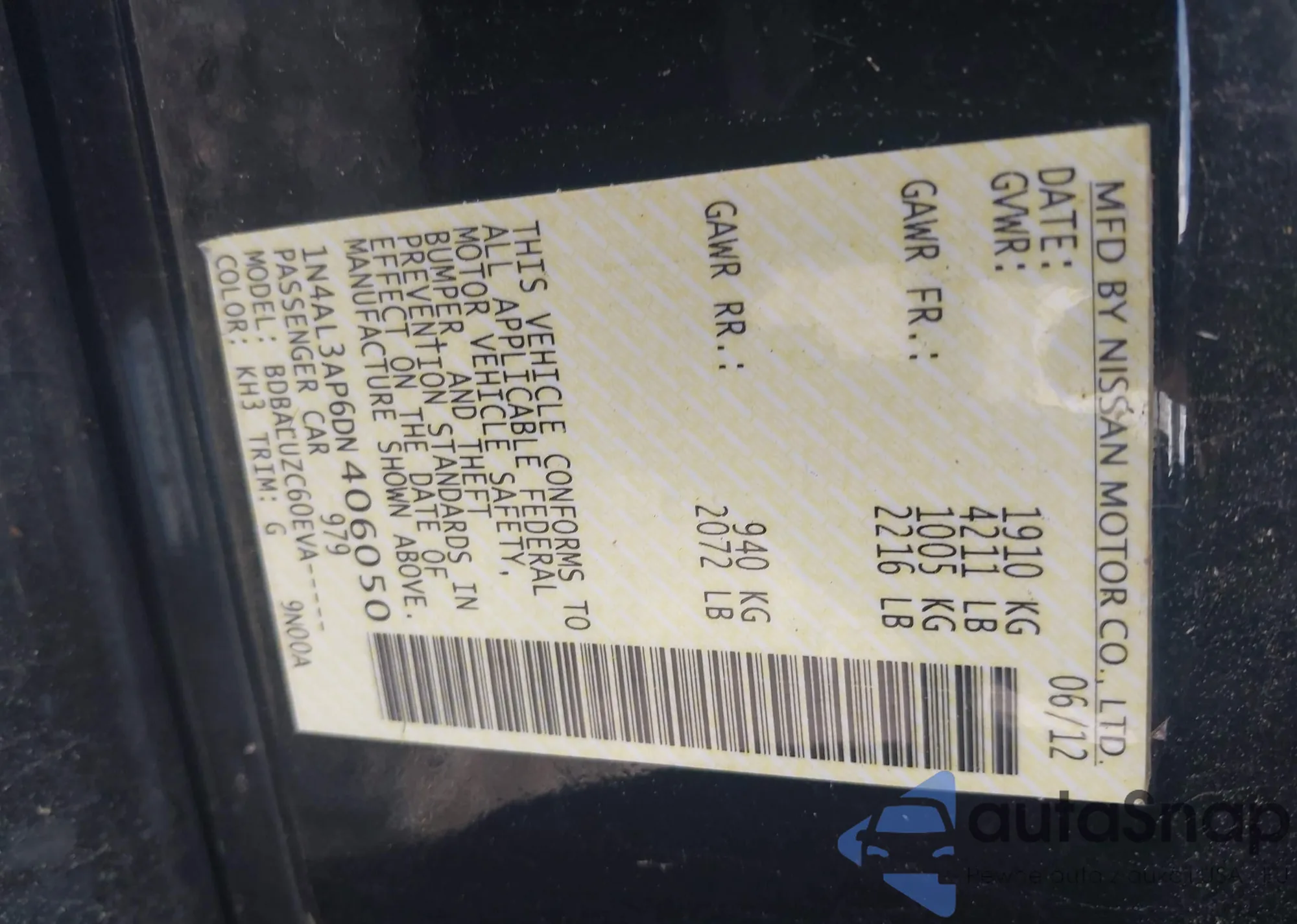 LOT: 39348938 VIN: 1N4AL3AP6DN406050
