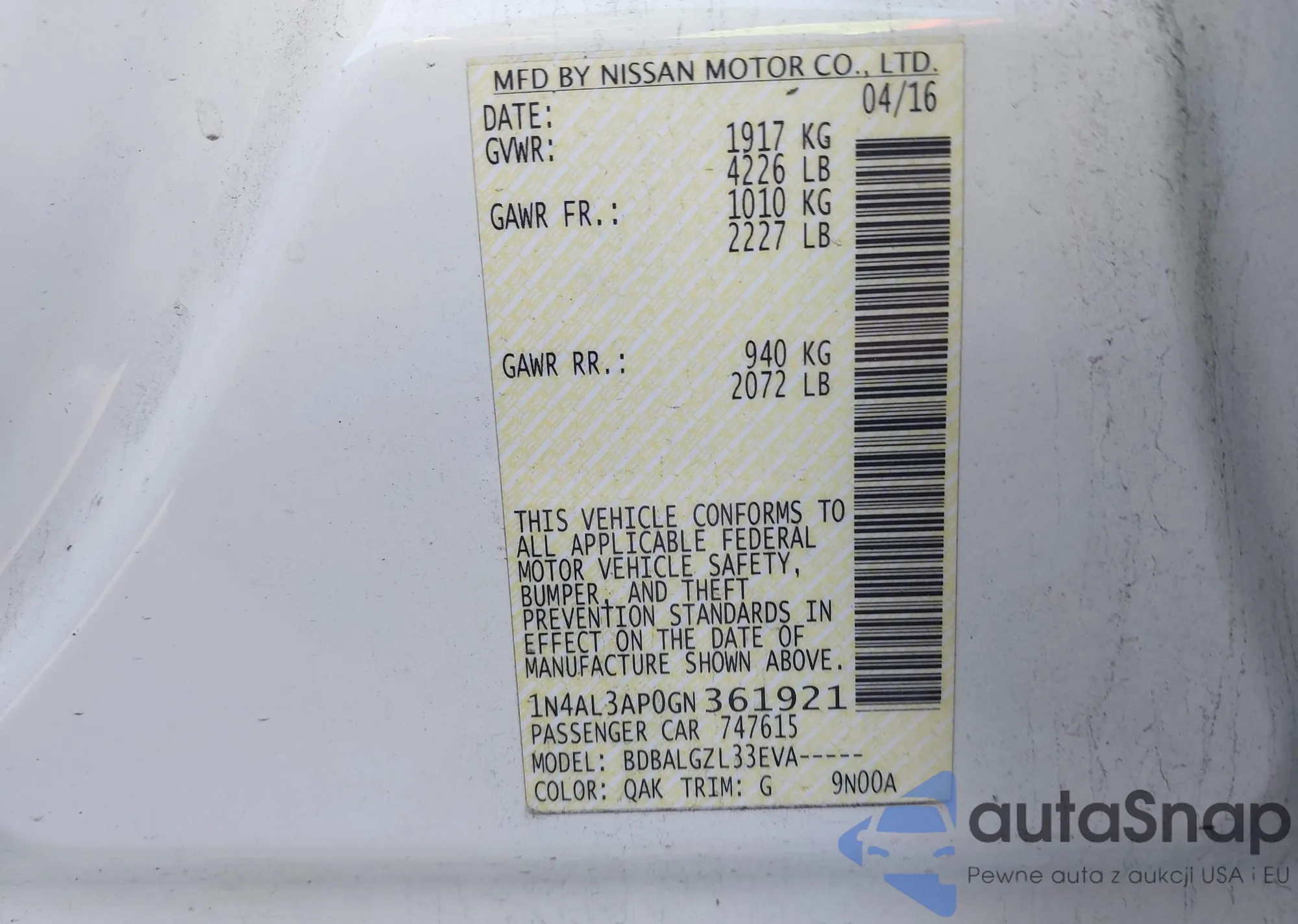 • VIN 1N4AL3AP0GN361921