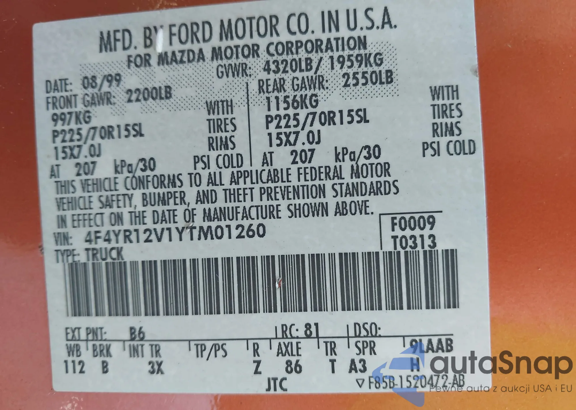 • VIN 4F4YR12V1YTM01260