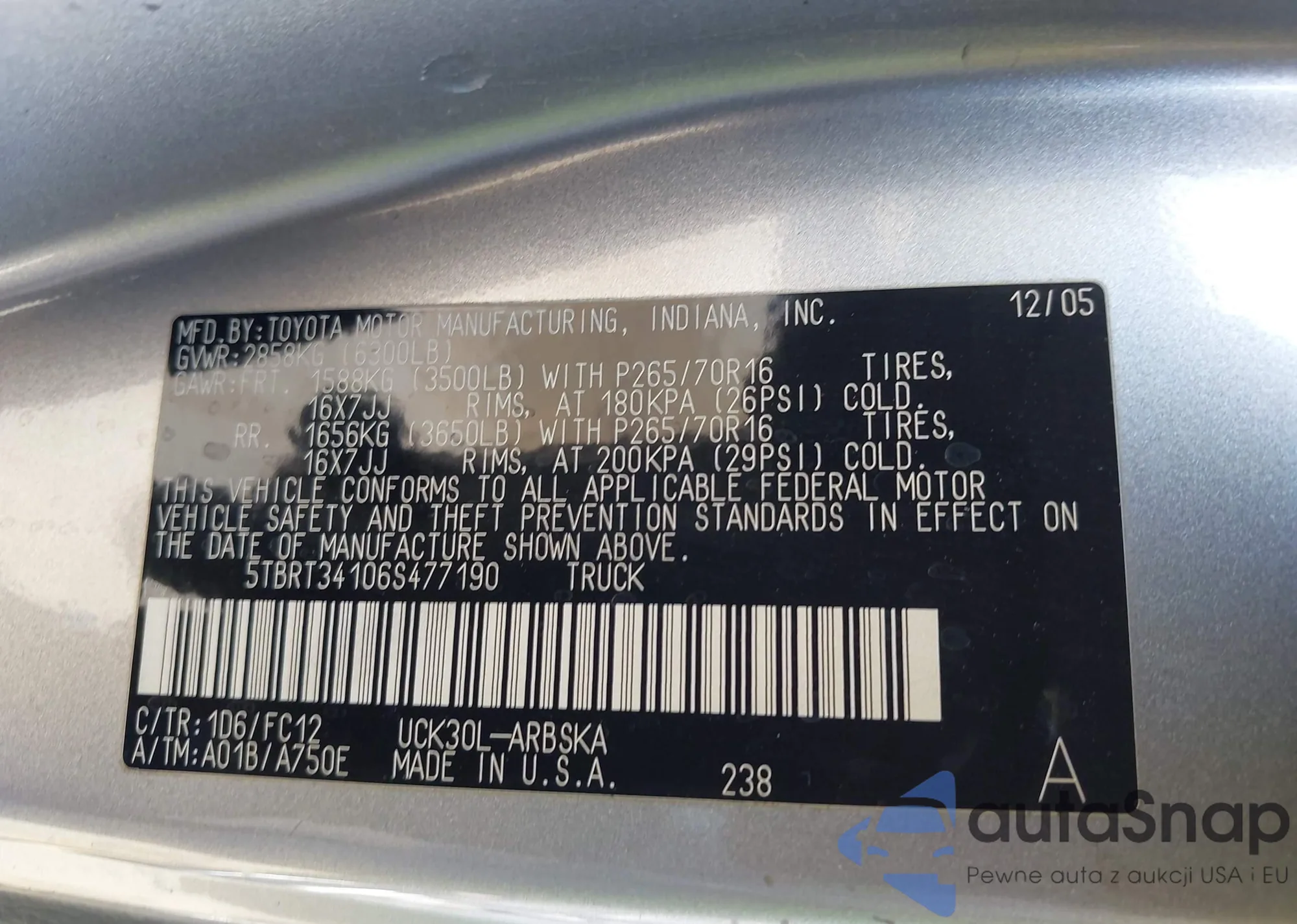 • VIN 5TBRT34106S477190