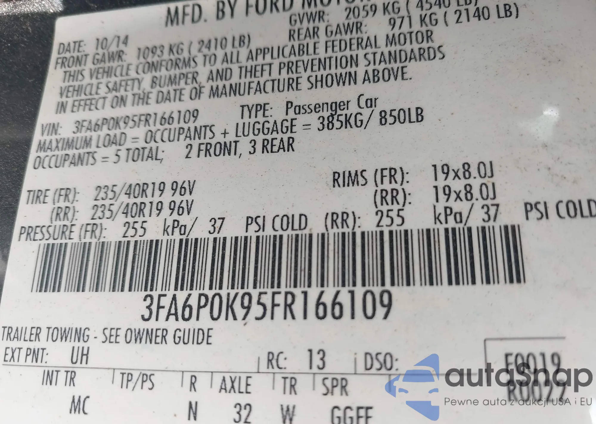 LOT: 43132614 VIN: 3FA6P0K95FR166109