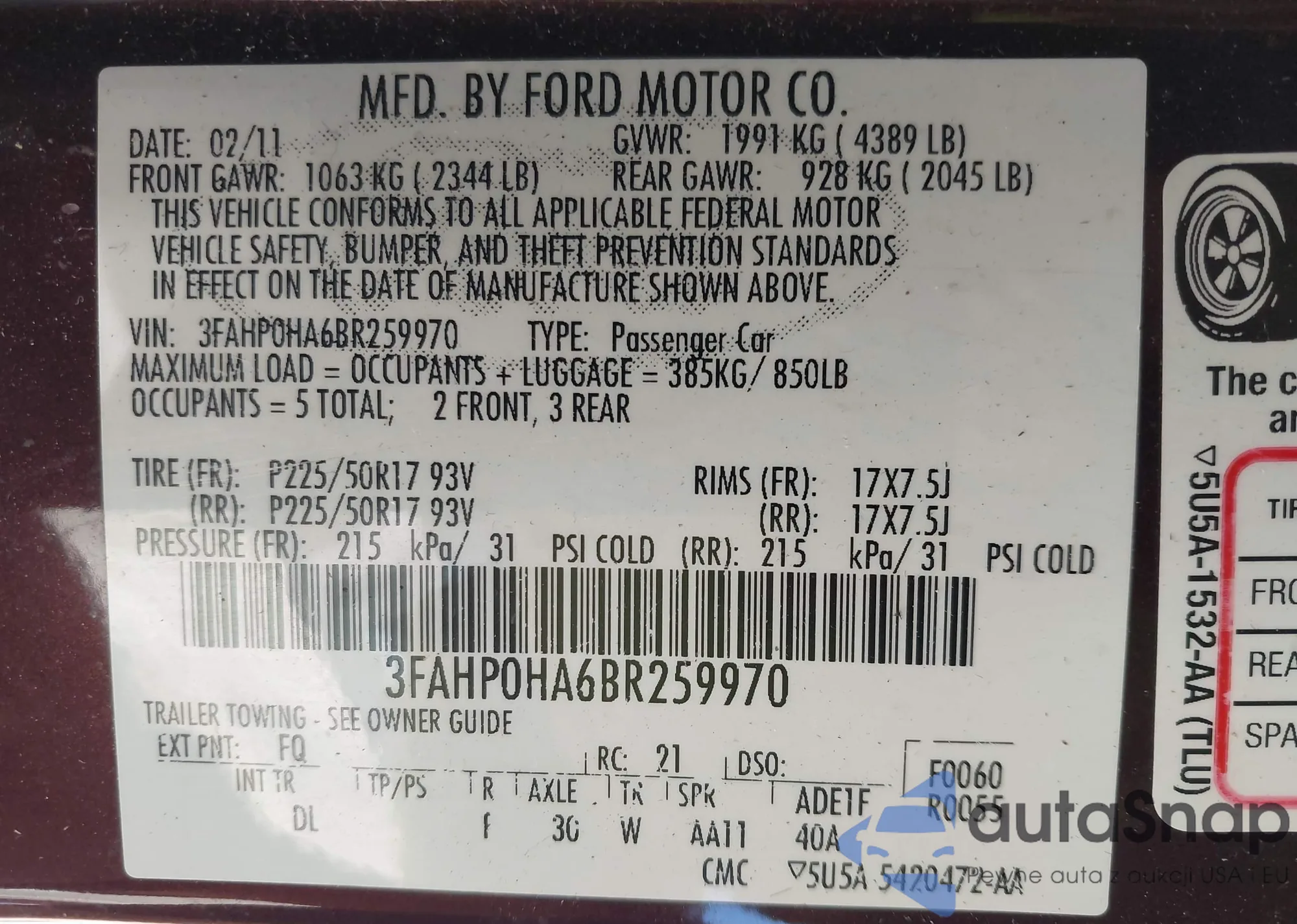 LOT: 42983535 VIN: 3FAHP0HAXBR105164