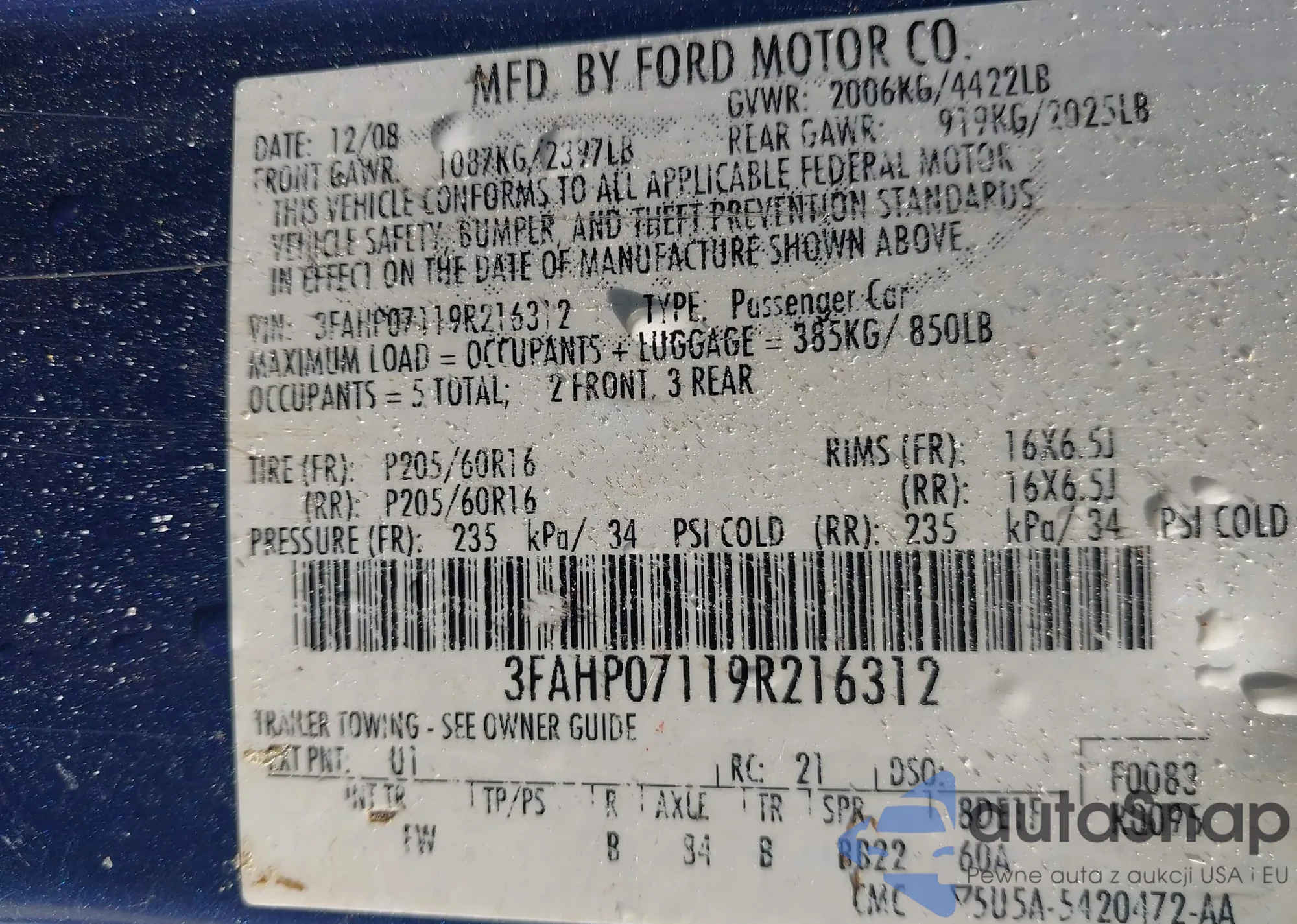 LOT: 43039158 VIN: 1FAHP2F85FG103718