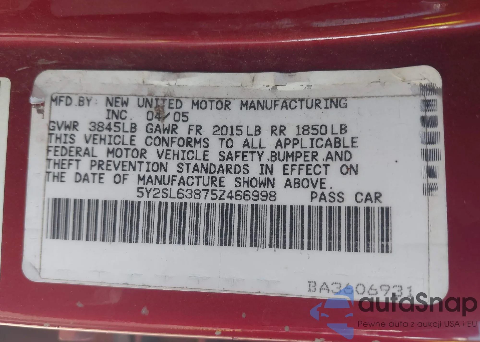 LOT: 43145462 VIN: 5Y2SL63875Z466998