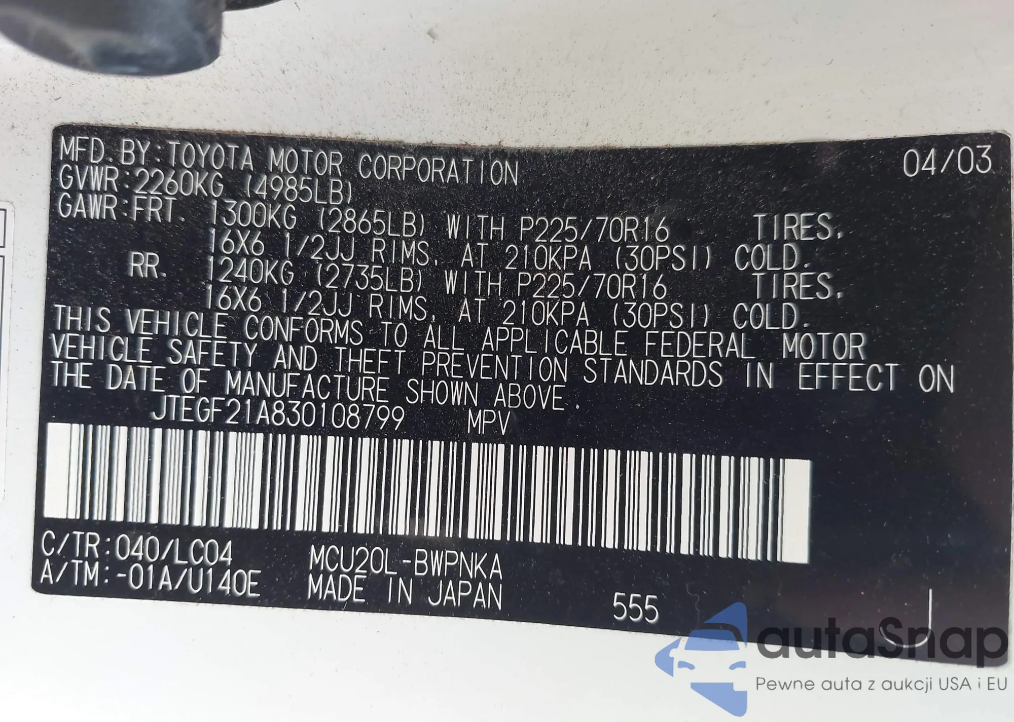 LOT: 43153641 VIN: JTEGF21A830108799
