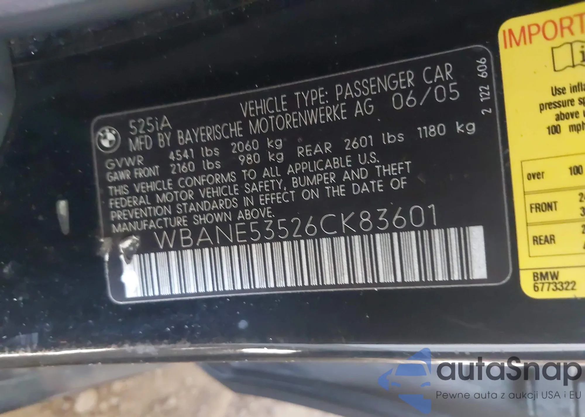 2006 BMW 525I z USA, uszkodzony, nr VIN WBANE53526CK83601