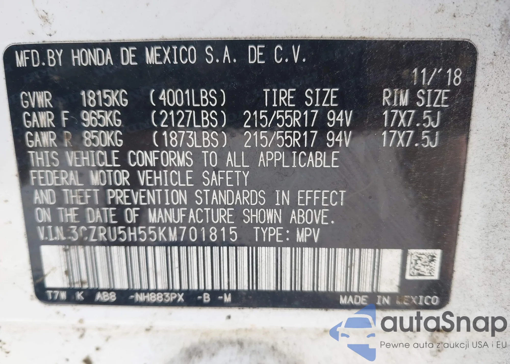 • VIN 3CZRU5H55KM701815