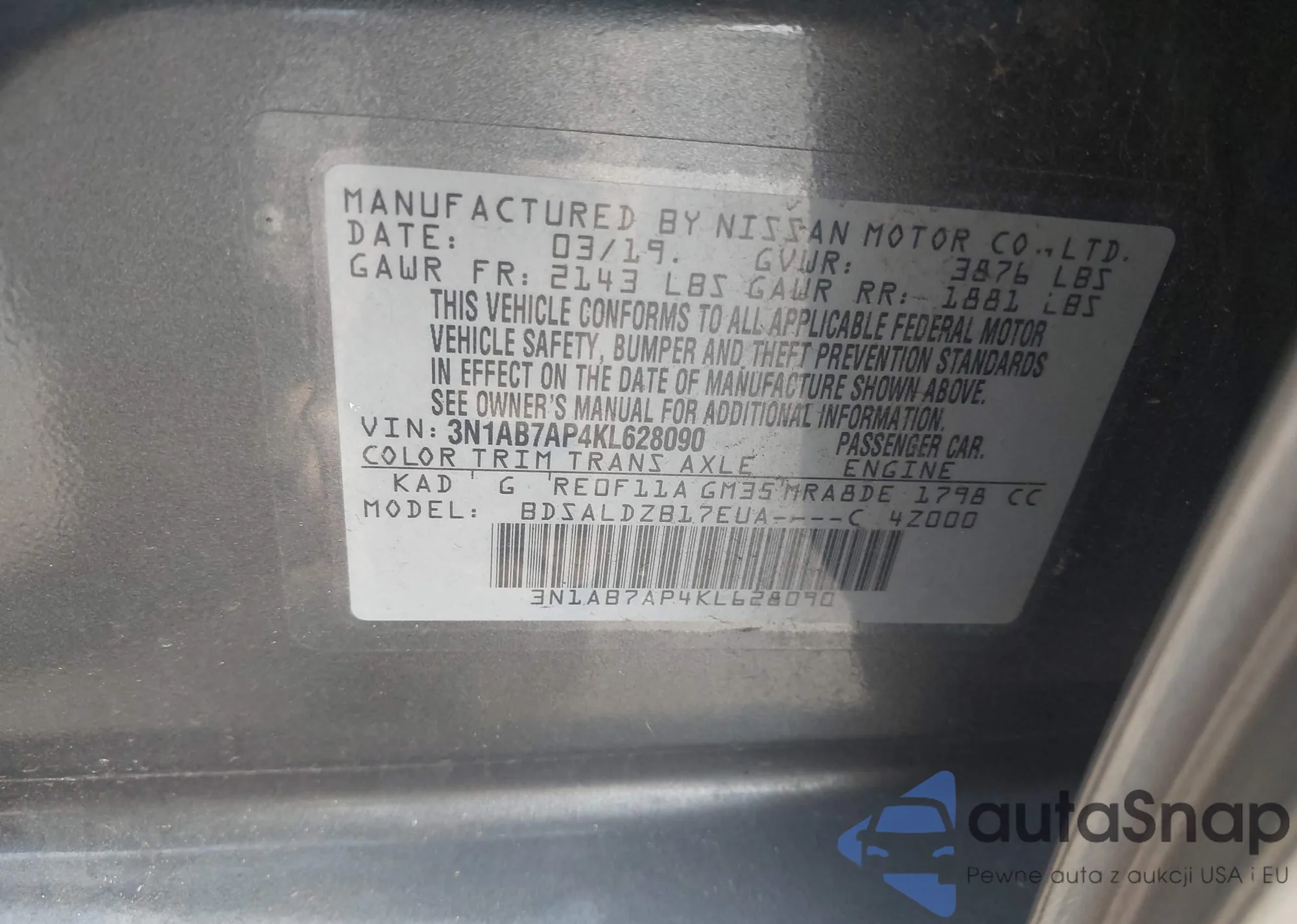 LOT: 43338211 VIN: 3N1AB7AP4KL628090