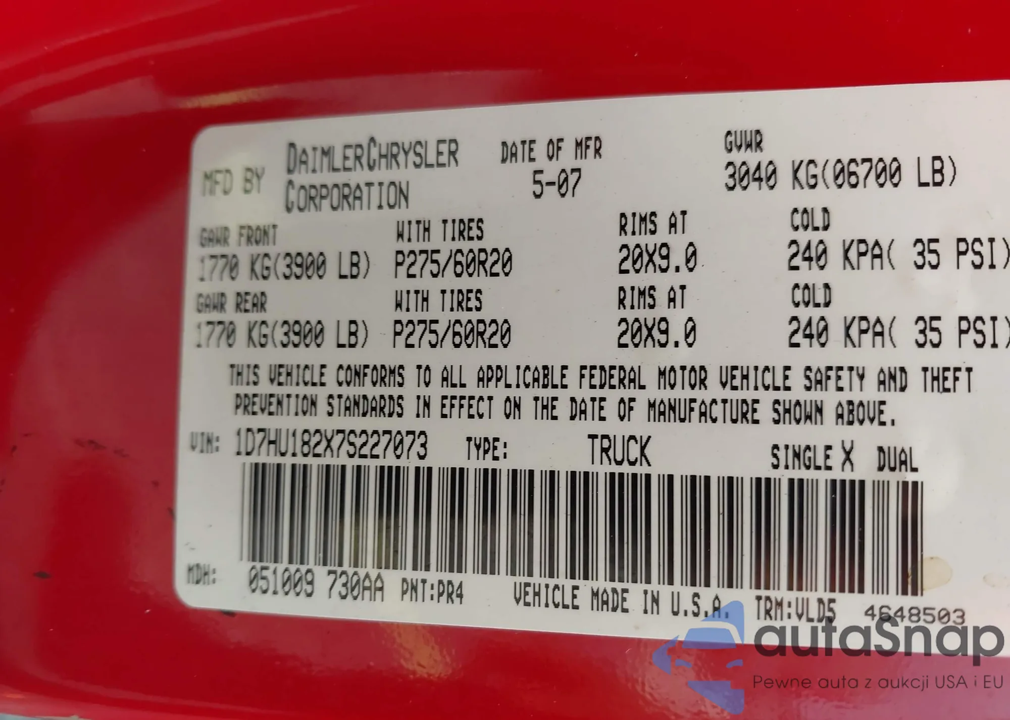 • VIN 1D7HU182X7S227073