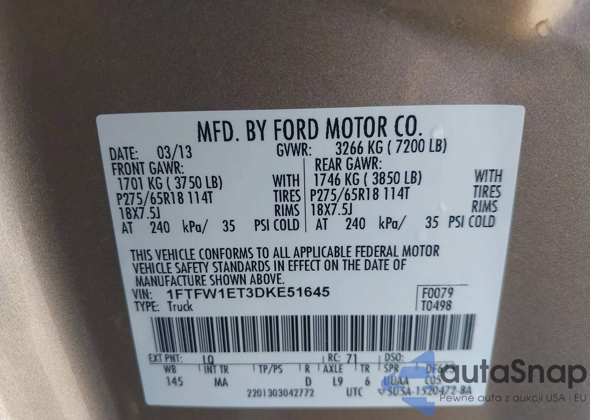 • VIN 1FTFW1ET3DKE51645