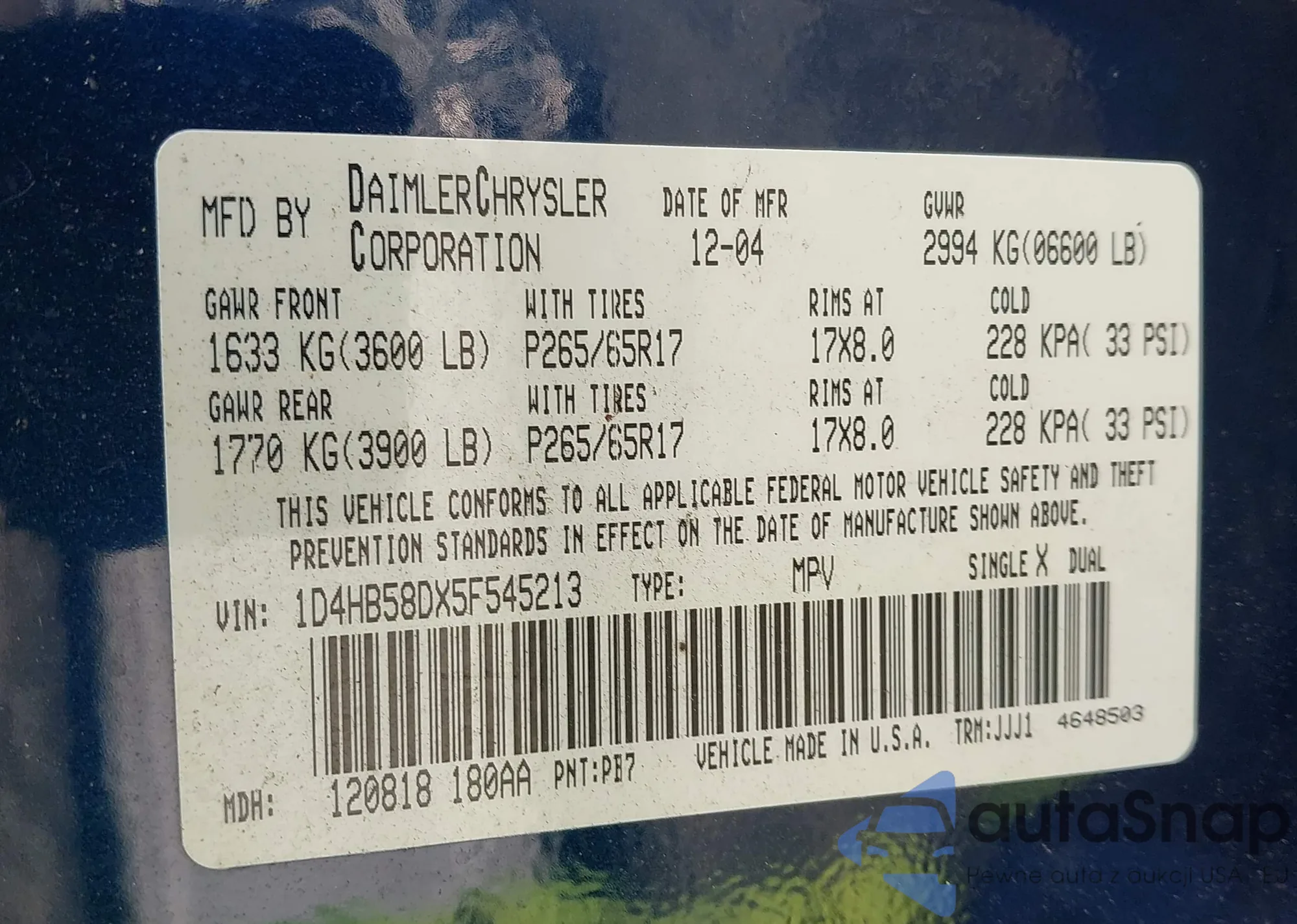 • VIN 1D4HB58DX5F545213