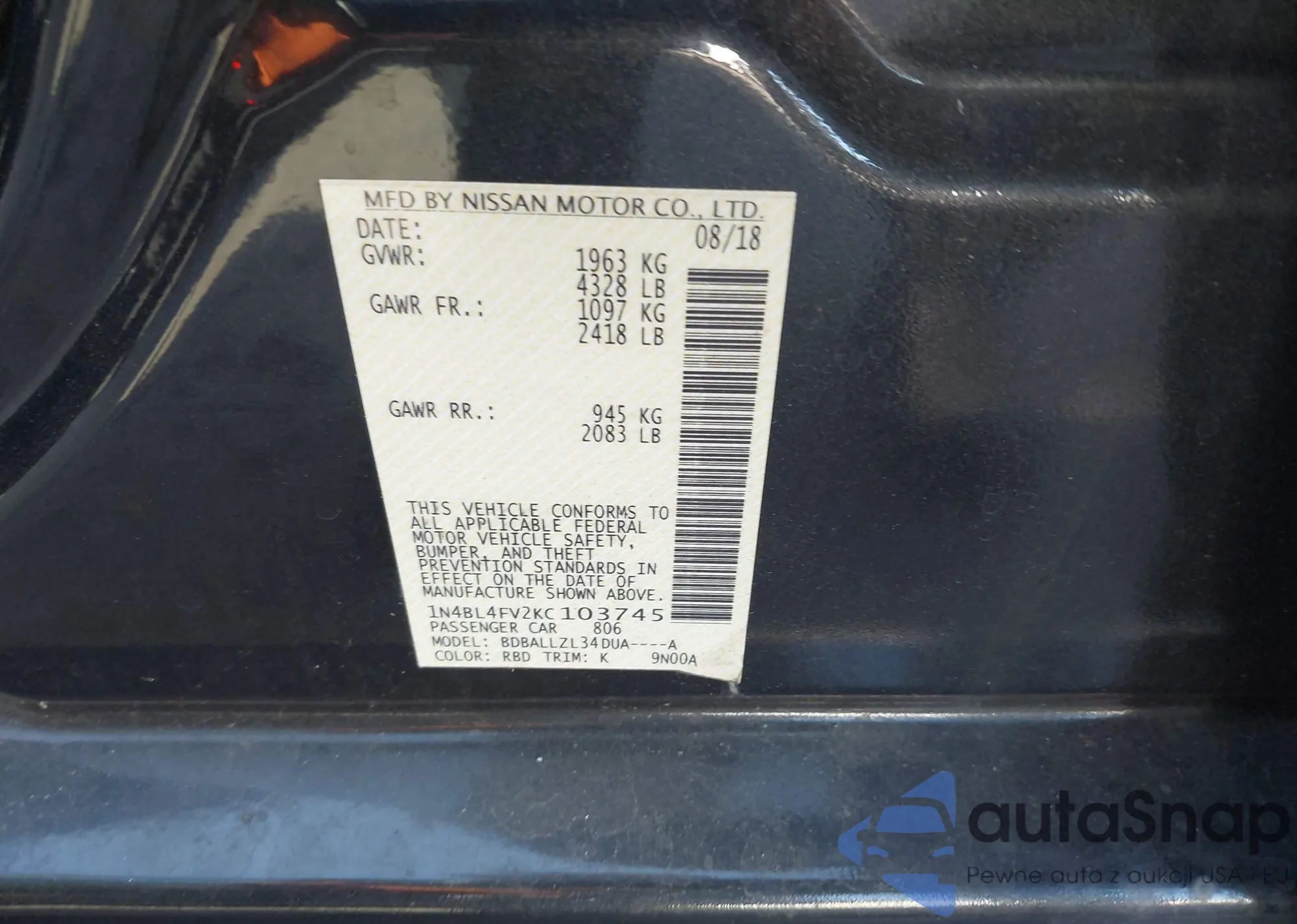 • VIN 1N4BL4FV2KC103745