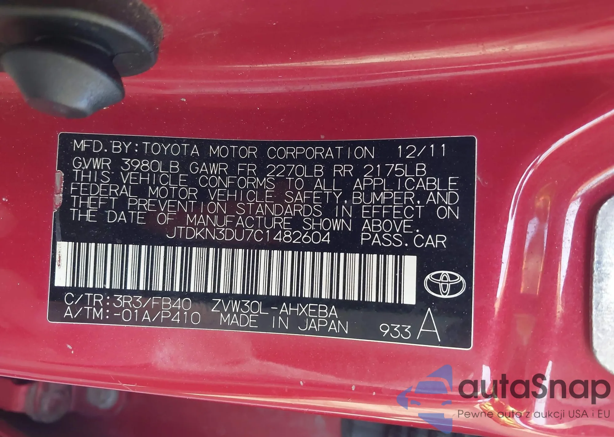 LOT: 43102428 VIN: JTDKN3DU7C1482604