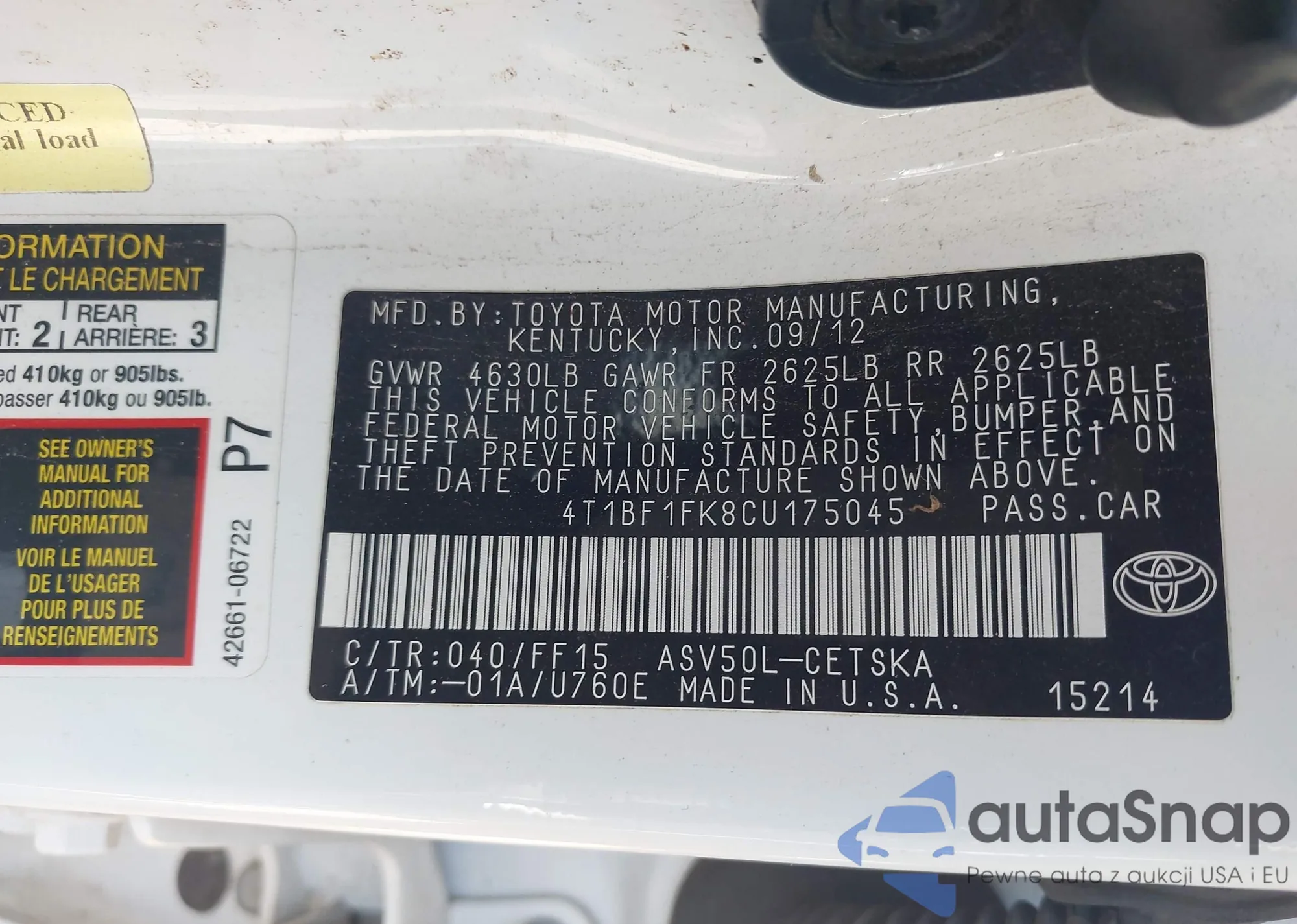 • VIN 4T1BF1FK8CU175045