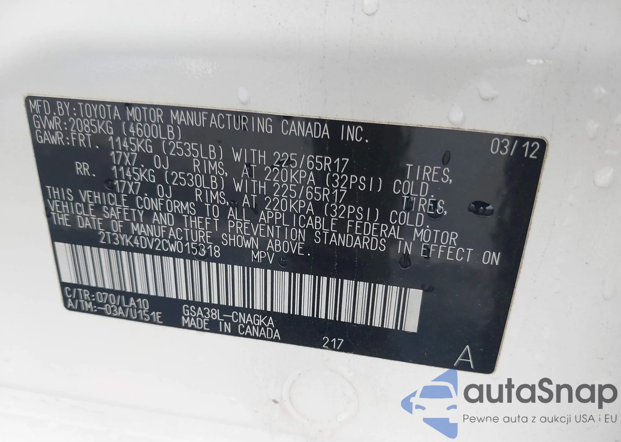 LOT: 43342685 VIN: 2T3YK4DV2CW015318