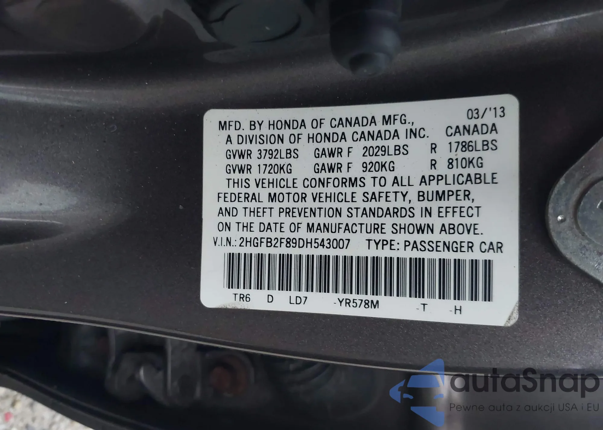 LOT: 43287305 VIN: 2HGFB2F89DH543007