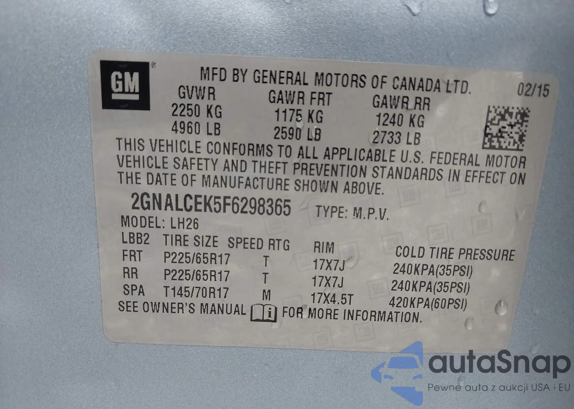 LOT: 42880837 VIN: 2GNALCEK5F6298365
